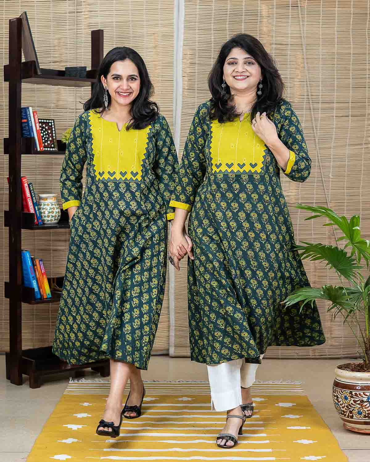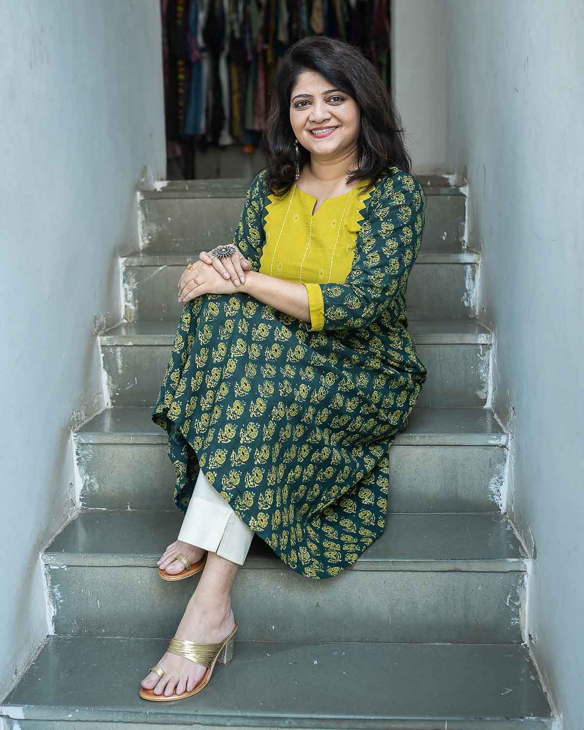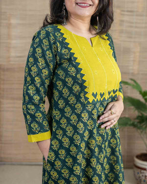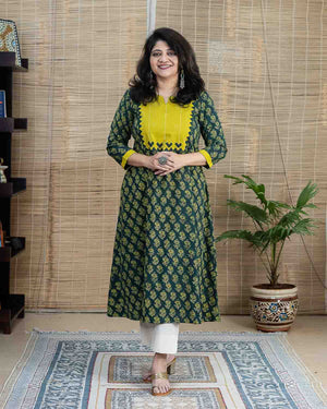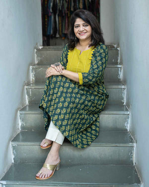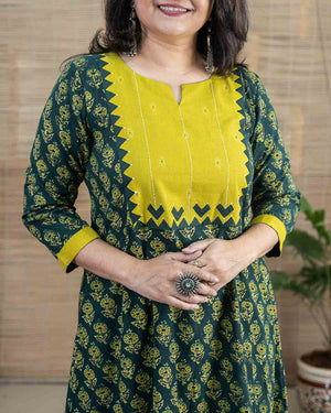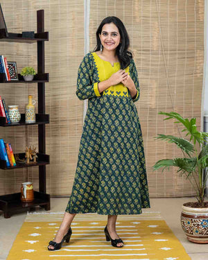 Ajrakh hand blocl printed cotton with contrast fresh green self woven patch with applique work and handwork stich lines in the front. Dress cum Kurta with 1 side pocket. 3/4th sleeves with contrast border. Unique color combination.