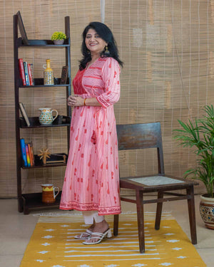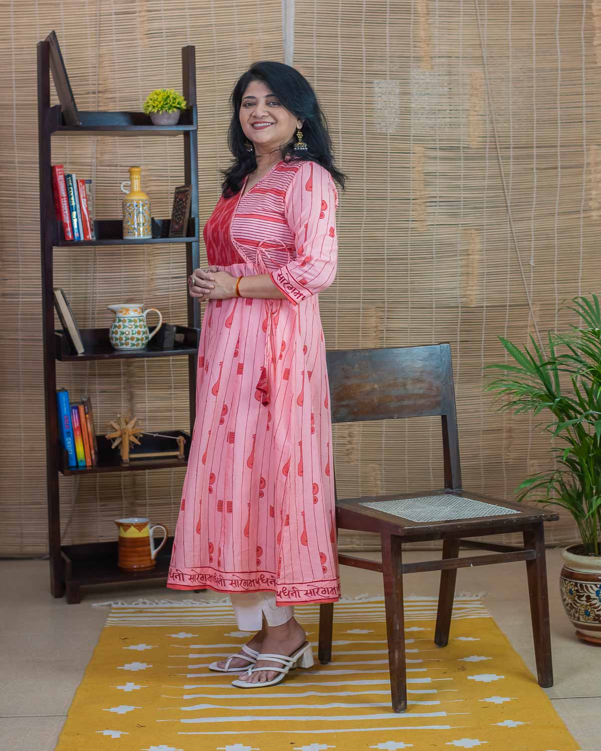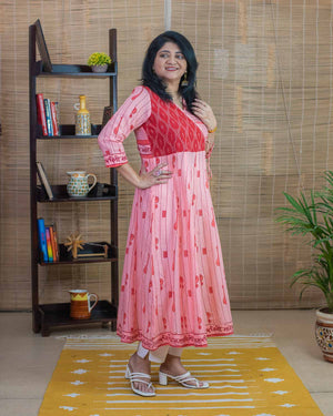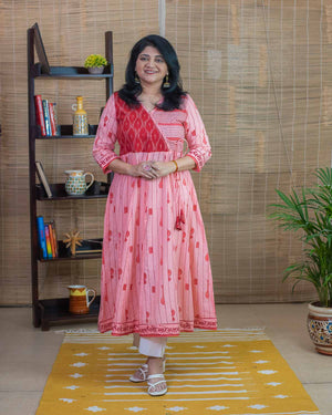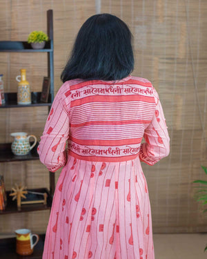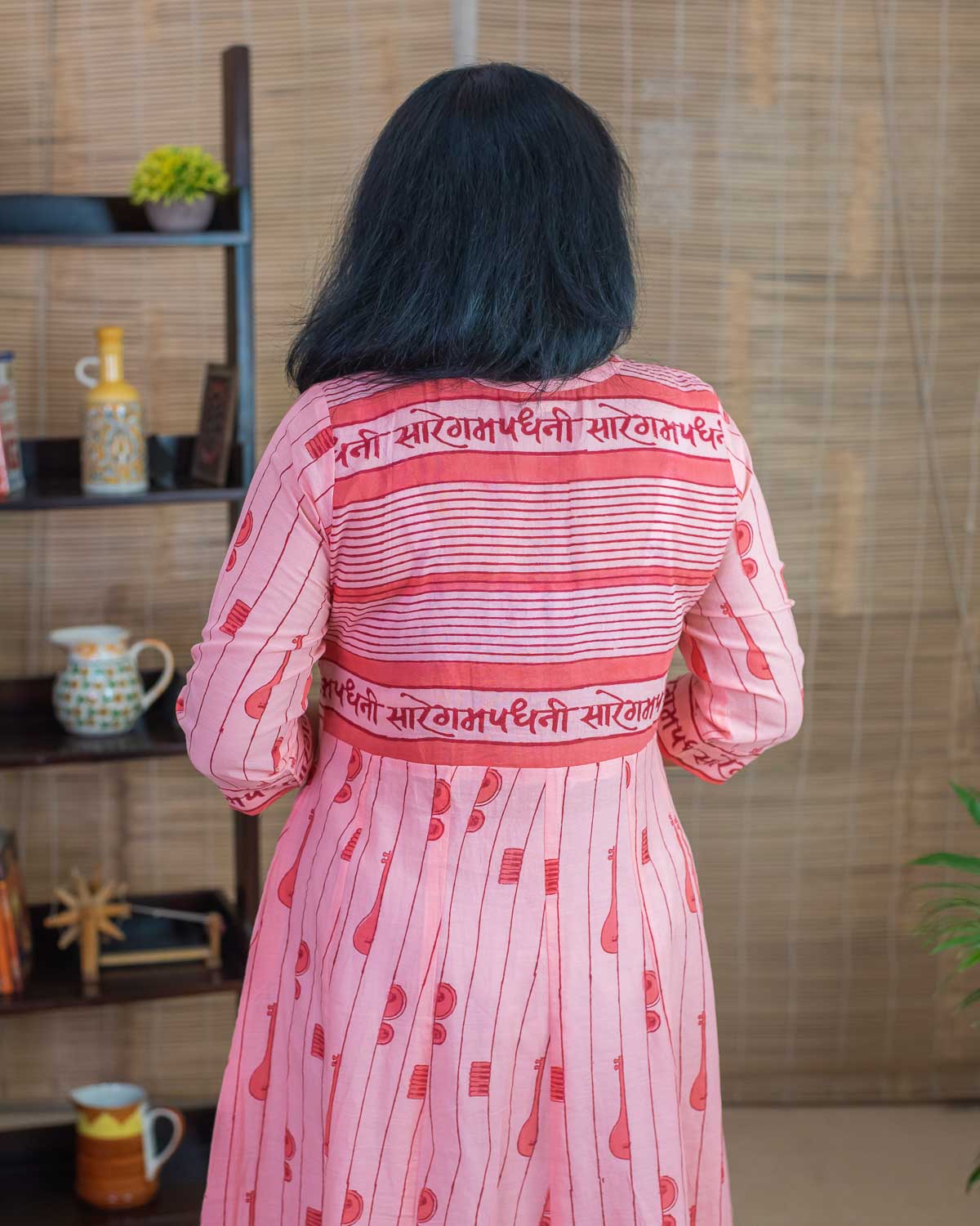 Pink / Red mul cotton hand block printed designer Kalidar / Anarkali with 12 kalis. The fabric is hand block printed with the Bandish, our signature musical block. Piping around the neck and the front patch. Ikkat Half body pattern in the front. "Sa re ga ma" hand block printed border in the back. Knots with tassels in the front. Sequin work to highlight.