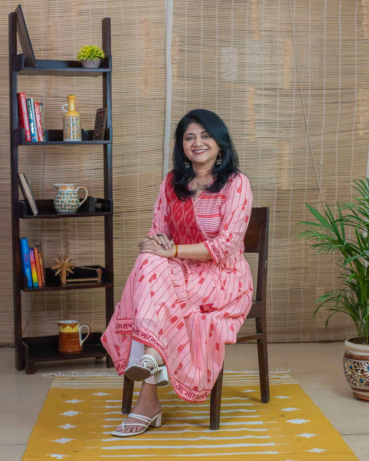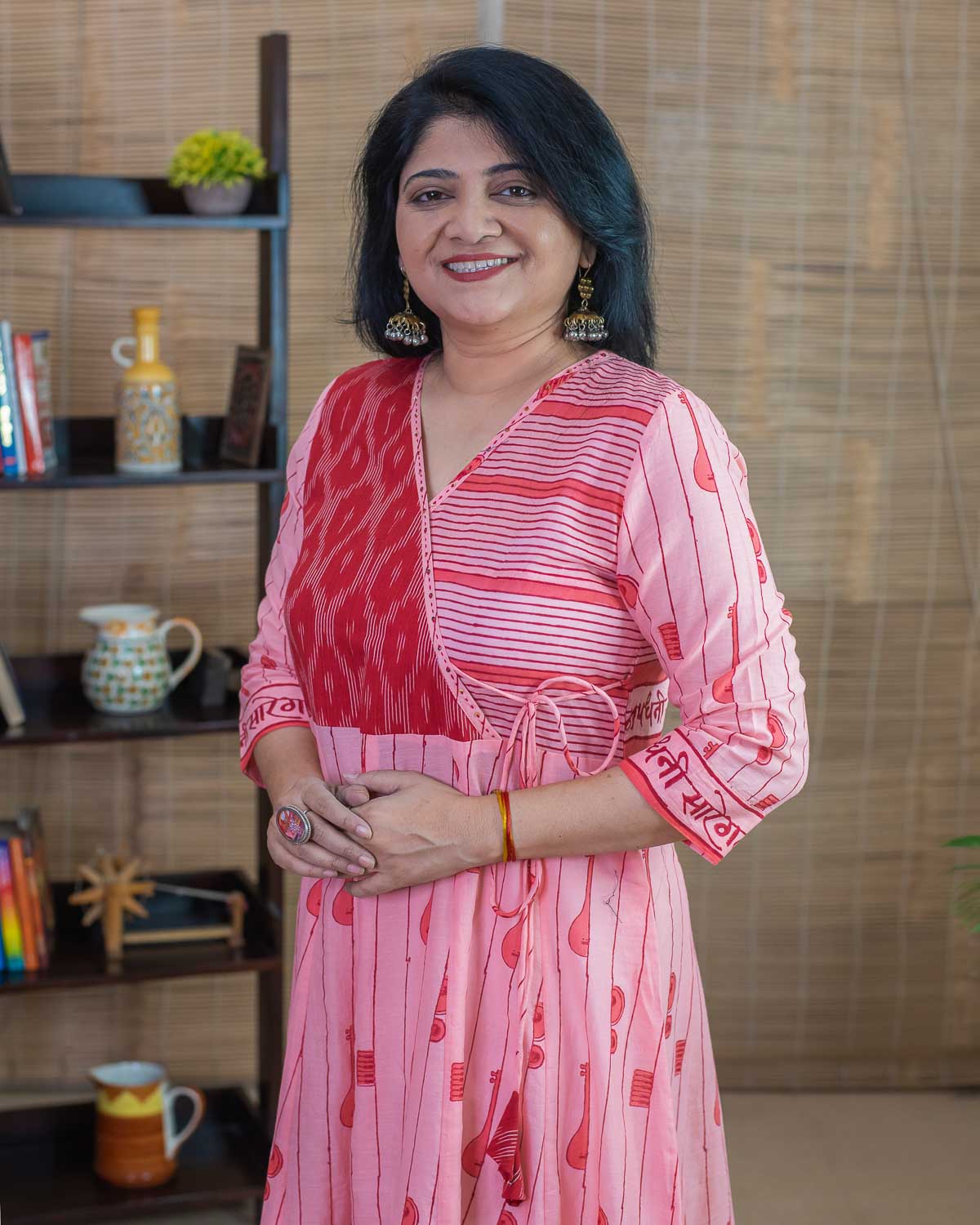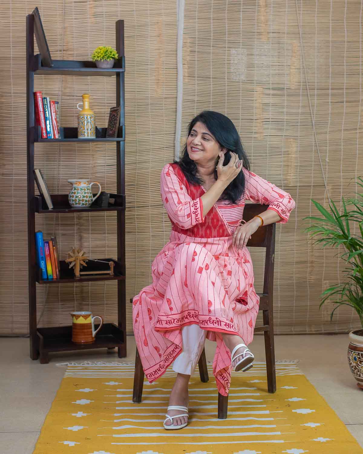 Pink / Red mul cotton hand block printed designer Kalidar / Anarkali with 12 kalis. The fabric is hand block printed with the Bandish, our signature musical block. Piping around the neck and the front patch. Ikkat Half body pattern in the front. "Sa re ga ma" hand block printed border in the back. Knots with tassels in the front. Sequin work to highlight.
