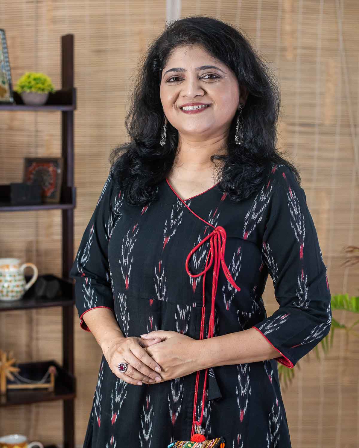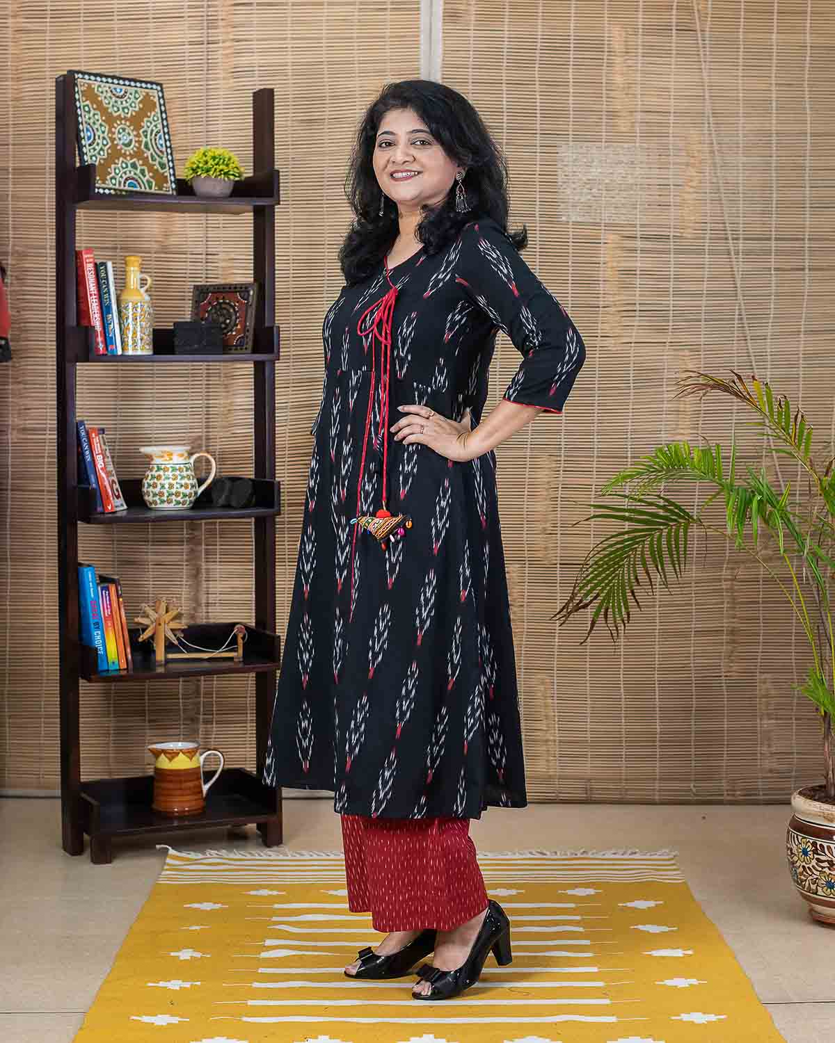 In-house designed handcrafted tassel. Black and red combination in single Ikkat weave. A line kurta with front side slits and a side pocket