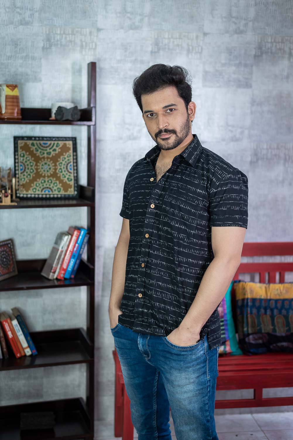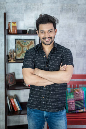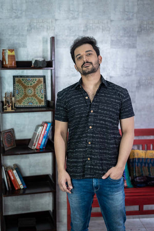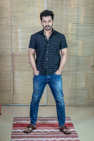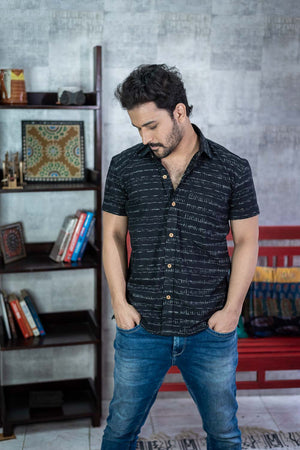Black double Ikkat hand woven cotton shirt with short sleeves, collars and wooden buttons detailing.