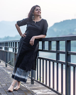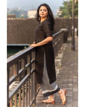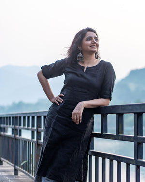 Black Linen Kurta with round neck & slit, Elbow length sleeves with button. If you love mix n match, this is a must have for your wardrobe. Match with your variety of bottom wear / accessories.