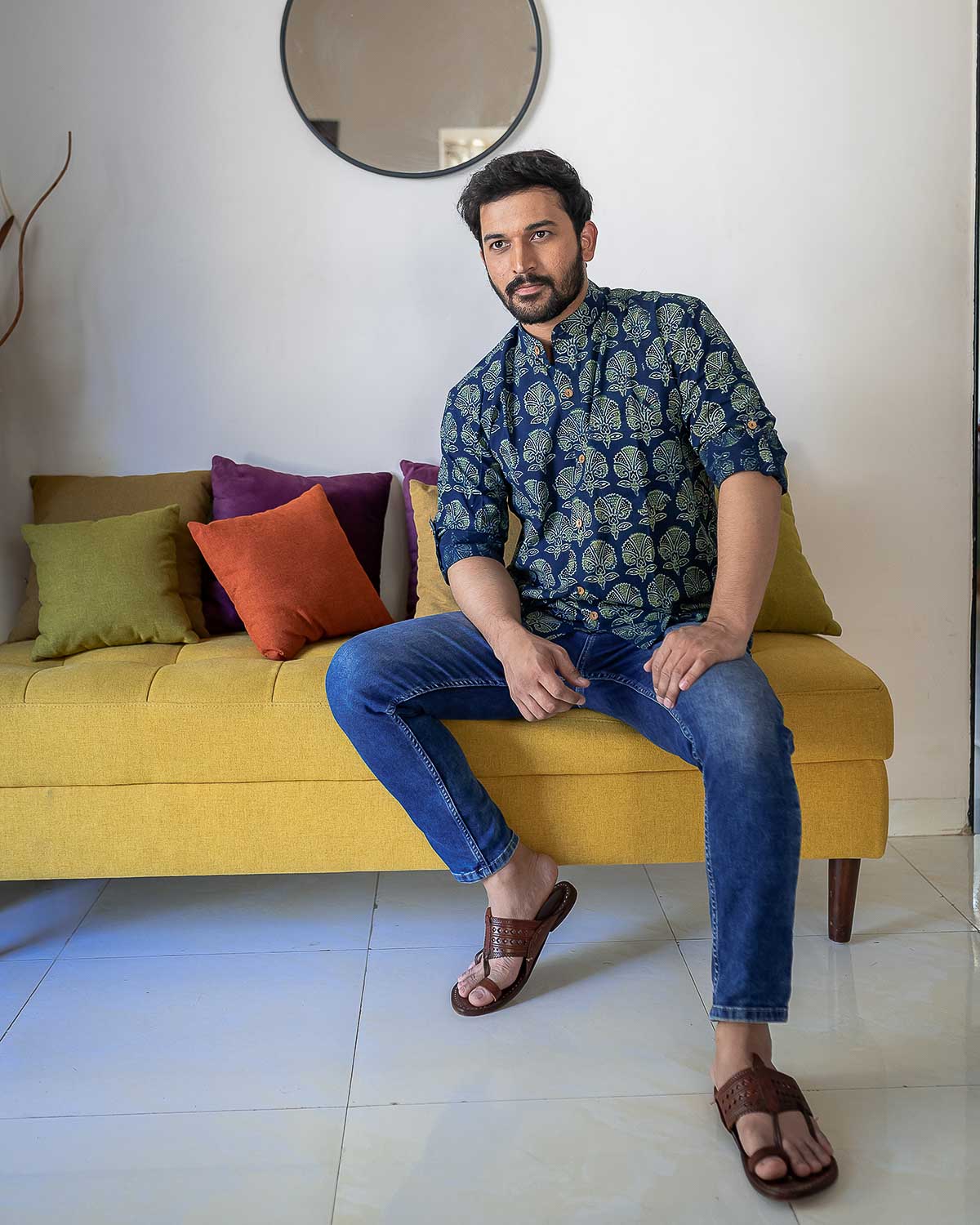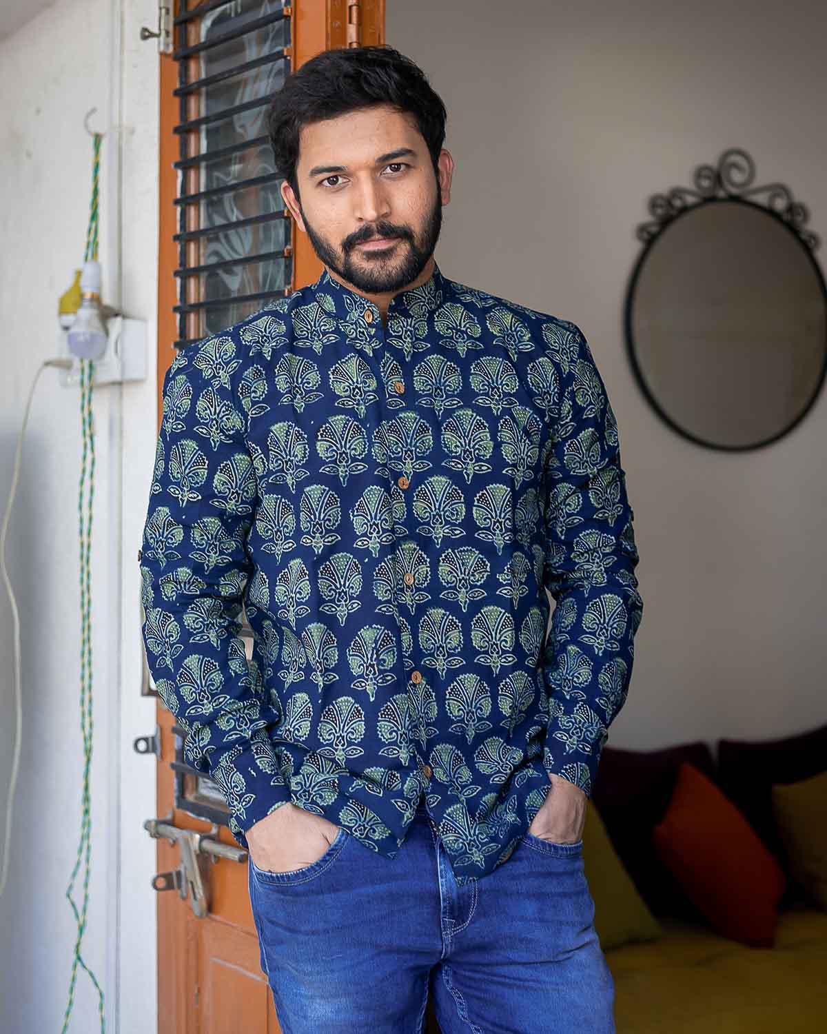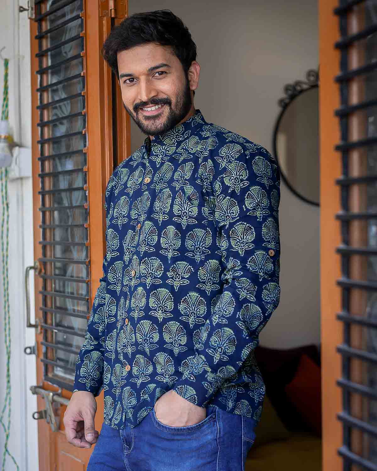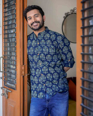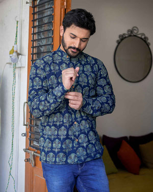 Blue Ajrakh block printed cotton shirt with full sleeves which can be rolled up with a wooden button and a string, collar and wooden buttons detailing.
