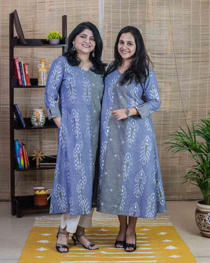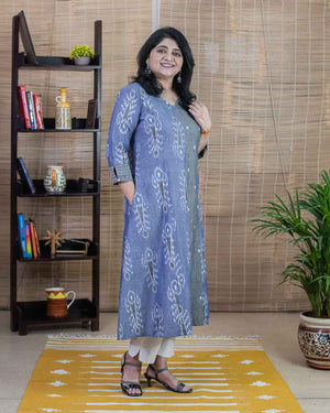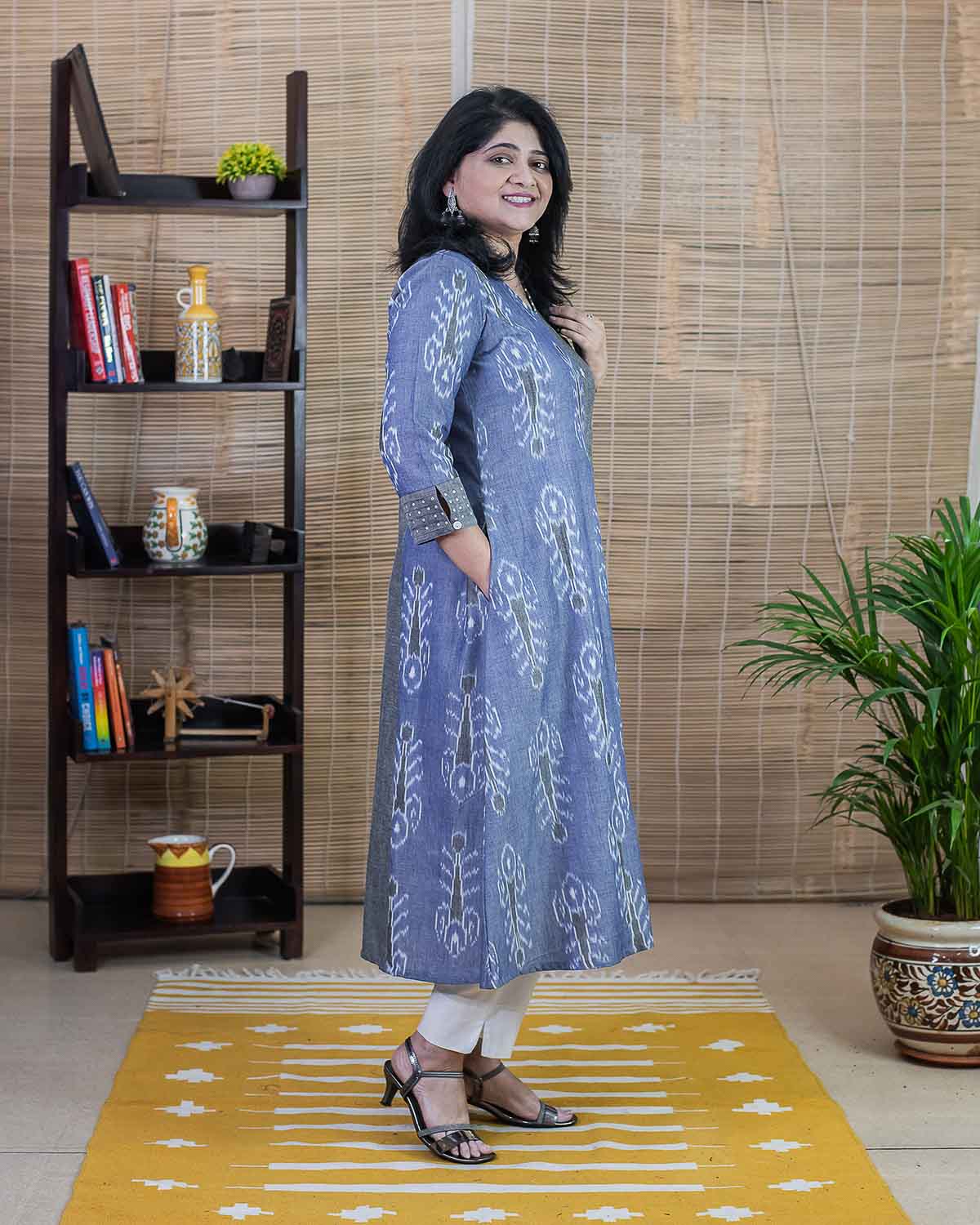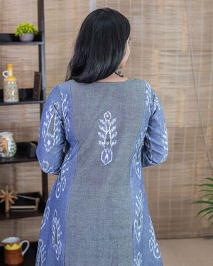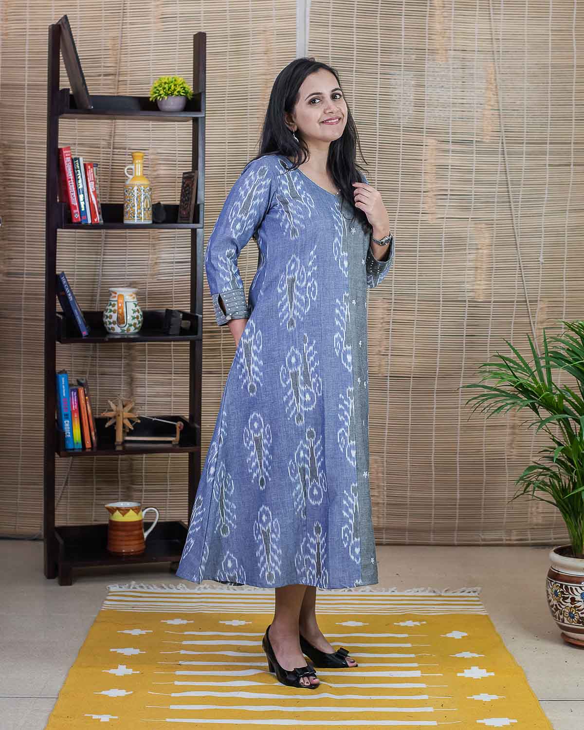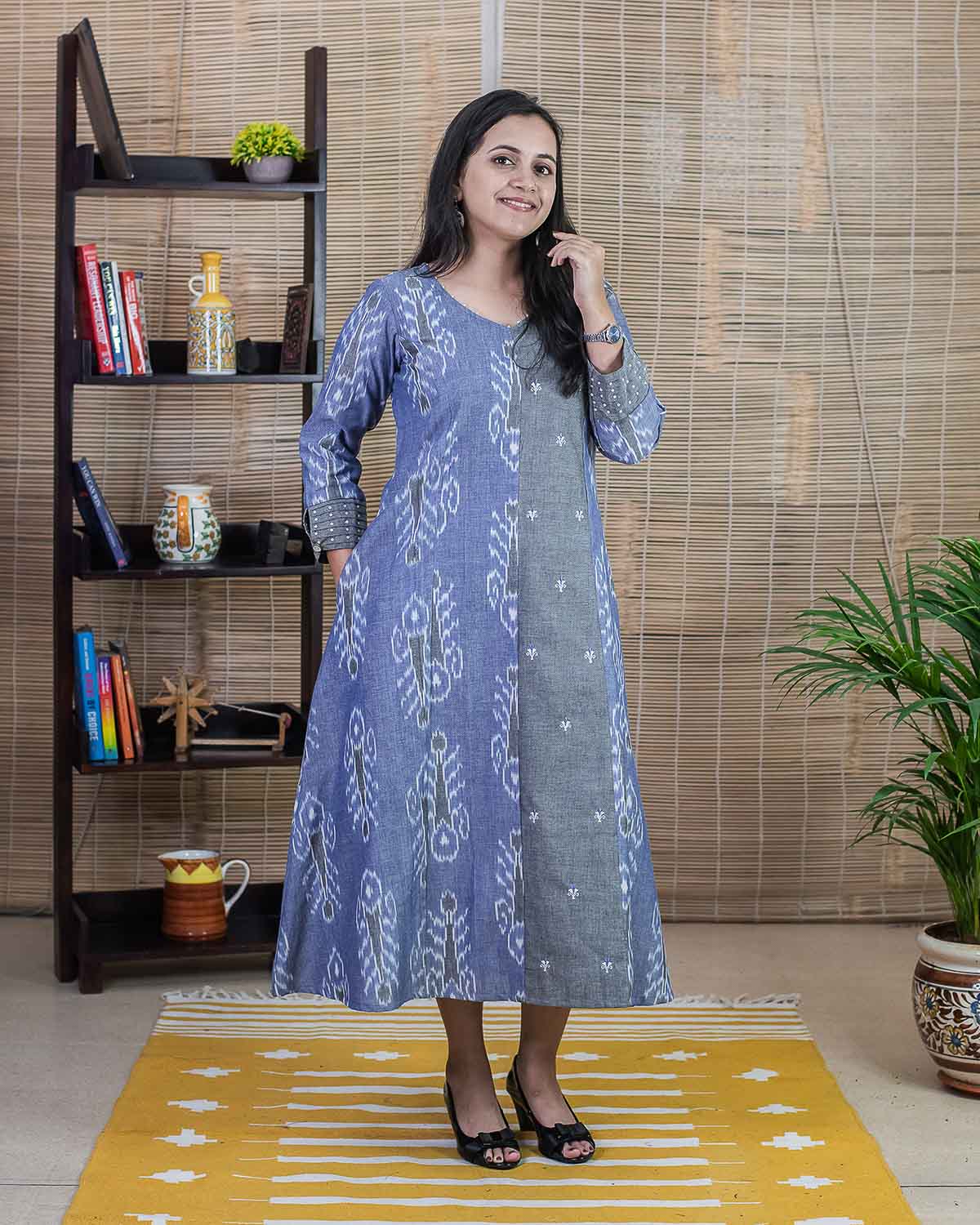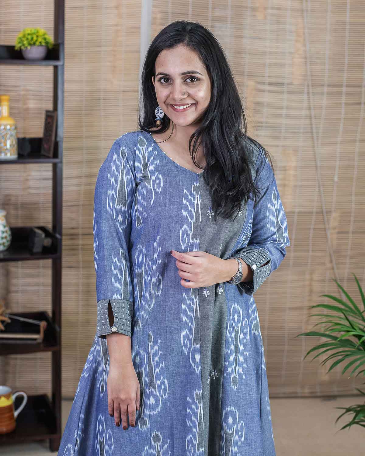 Elegant blue gray color combination. Special Cambodia inspired ikkat weave in blue, rare motif. Highlighted with machine and hand embroidery in the front and back and the sleeves. An exclusive Aline Kurta cum dress in our ikkat collection. 1 side pocket. Applique work Detailing in the back. Sequin work and pleats with button detailing for the sleeves. Buy this ethnic wear for any casual/office wear.