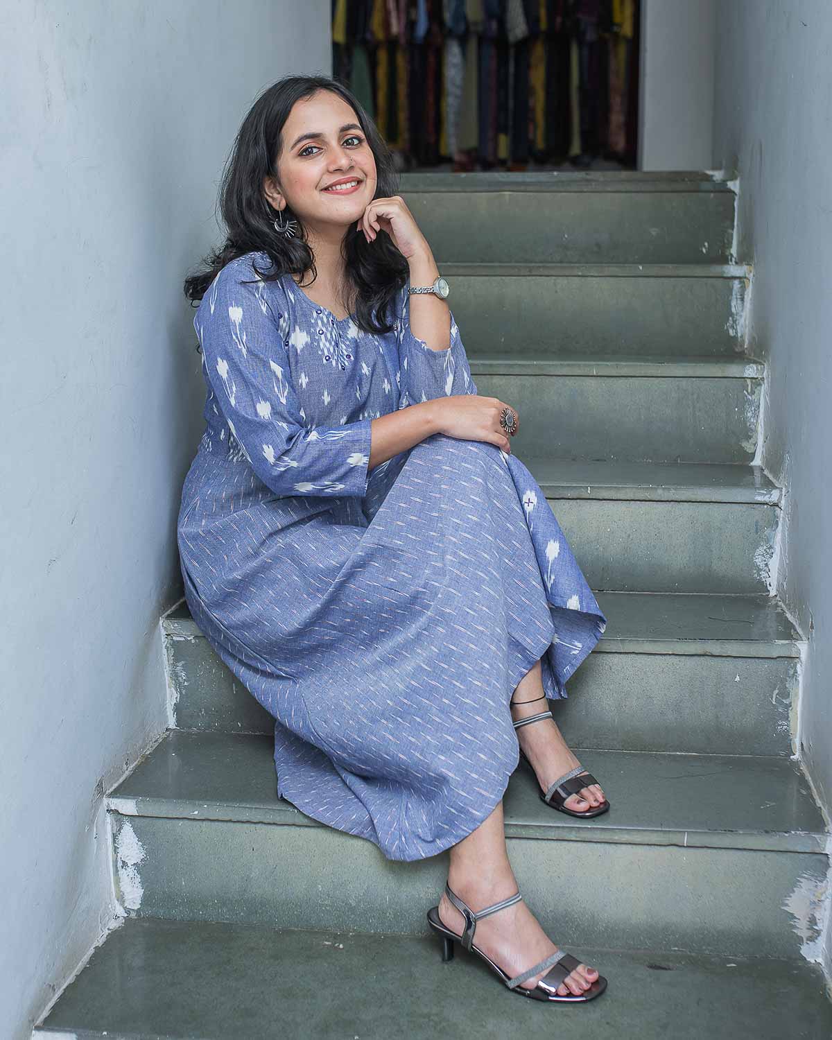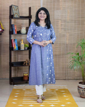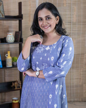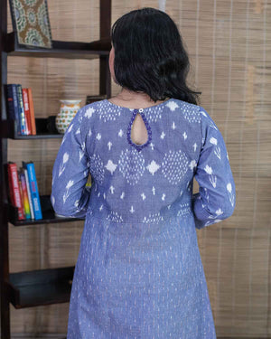 Elegant blue color in 3 exclusive ikkat weaves highlighted with machine and hand embroidery in the front and back. An exclusive Aline Kurta cum dress in our ikkat collection. 1 side pocket. Detailing in the back. Buy this ethnic wear for any casual/office wear.