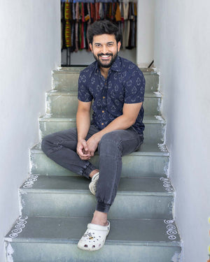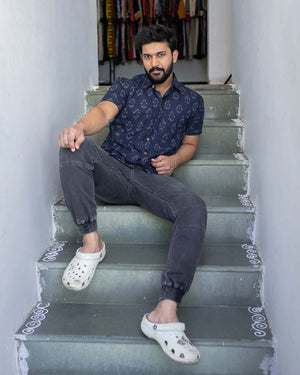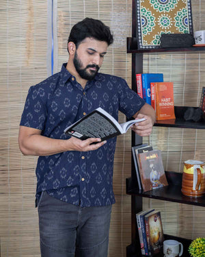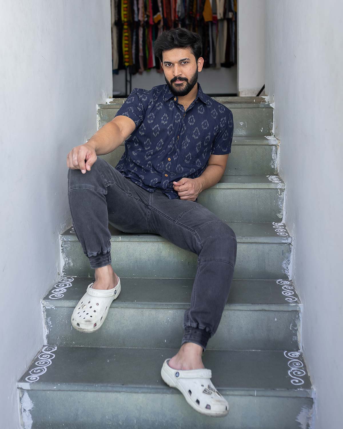 Blue Ikkat, hand woven cotton shirt with short sleeves, collar and wooden buttons detailing.