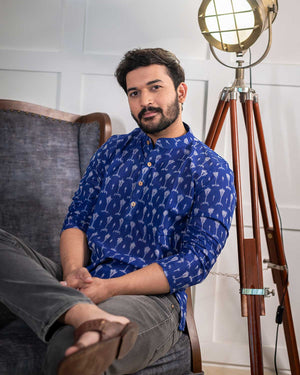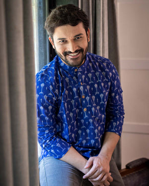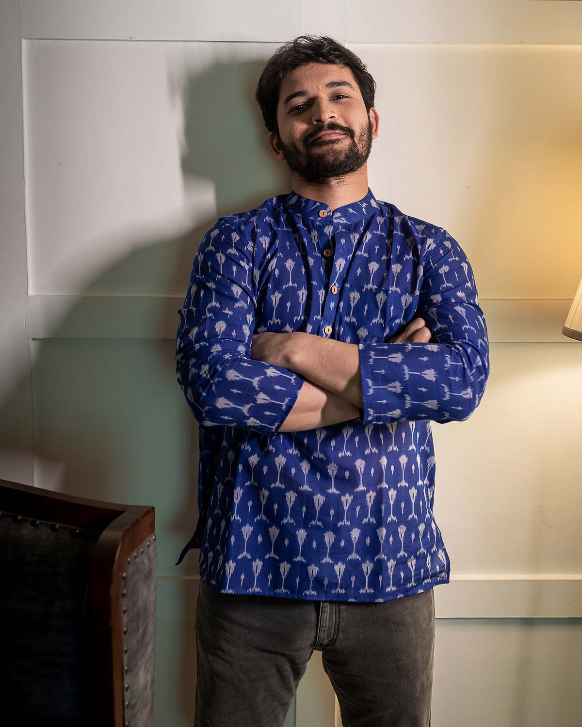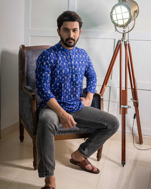 Blue Mercerized Ikkat Short Kurta short kurta with wooden buttons. Mercerized fabric has 1 thread cotton and 1 thread silk because of which it has a shining.