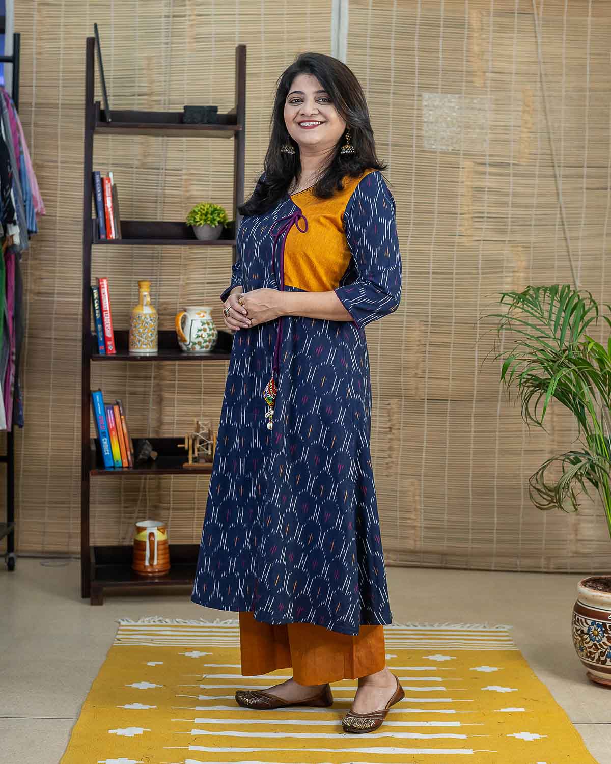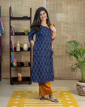 Blue Mustard Ikkat A line Kurta with inhouse handcrafted tassel