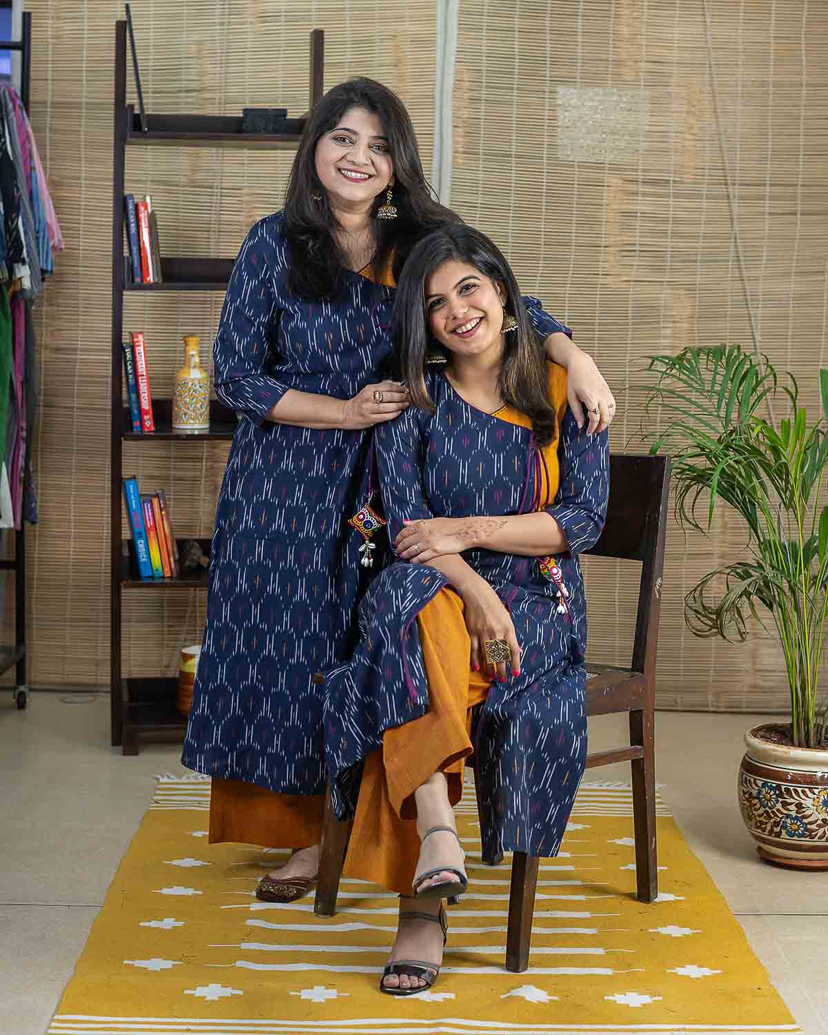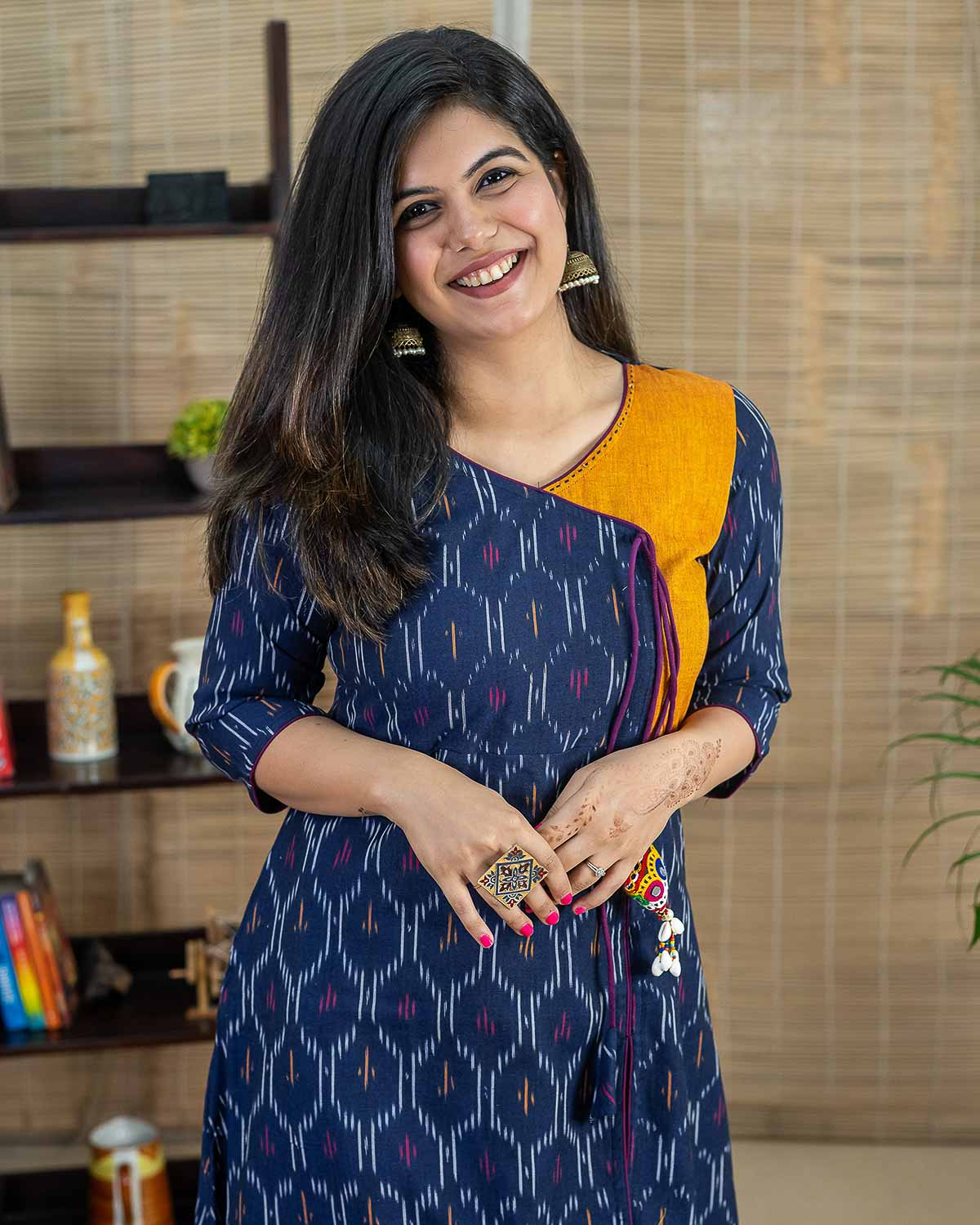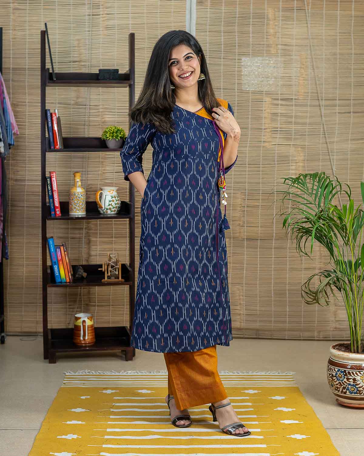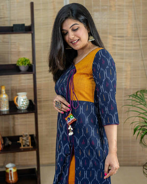 In-house designed handcrafted tassel. Navy blue and mustard combination in single Ikkat weave. A line kurta with front side slits and a side pocket