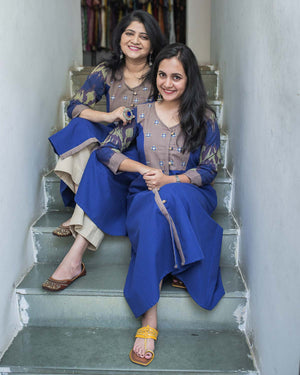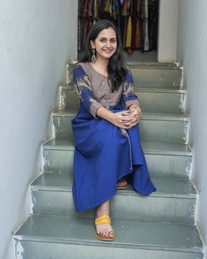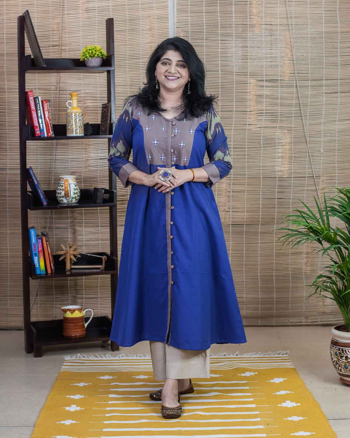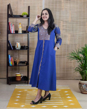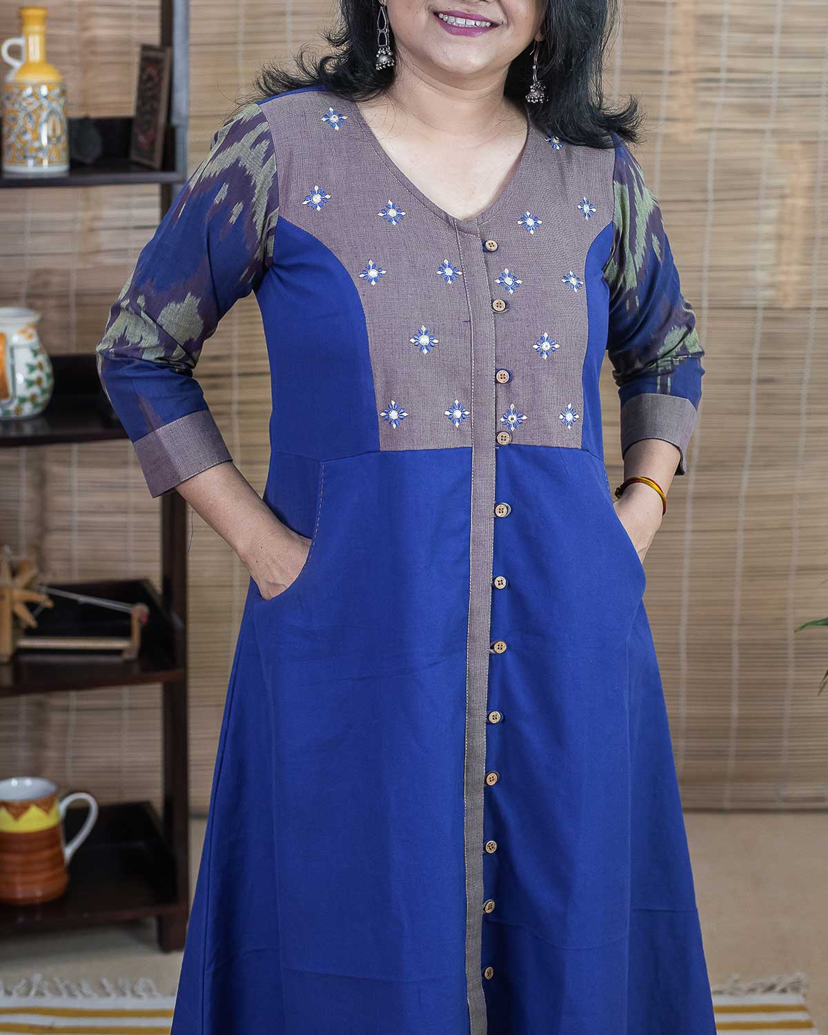 This is a special product – Exclusive a line dress cum kurta with rare find exclusive ikkat weaves. Designer ikkat sleeves. Base fabric and the brown patchwork fabric is also a handwoven ikkat (count of this woven fabric is same as ikkat woven fabric). Front patch highlighted with machine embroidery. Detailing of piping and wooden buttons in the front. 2 pockets.