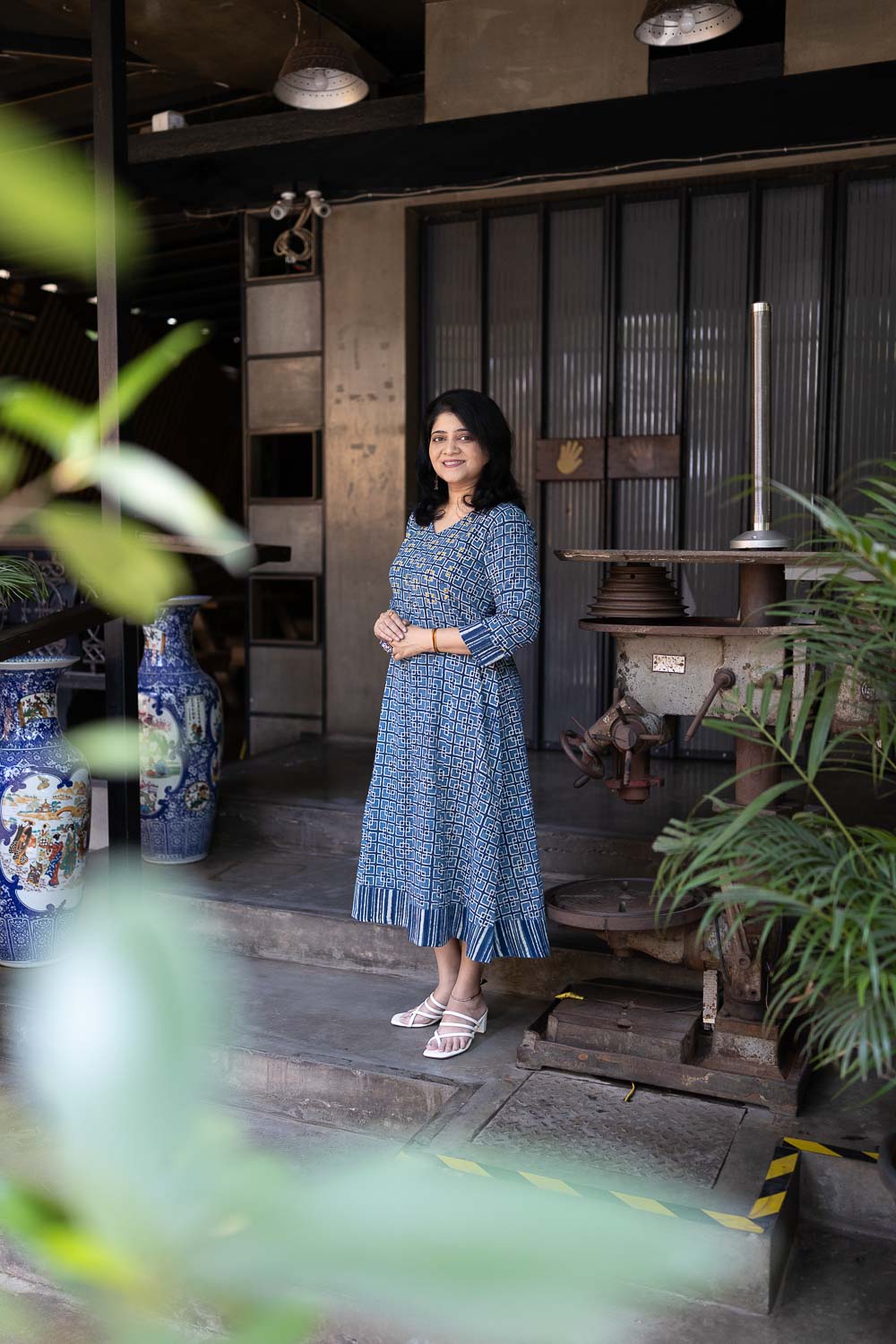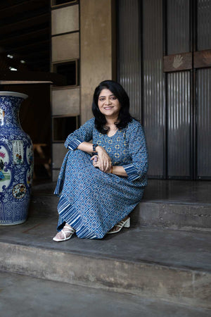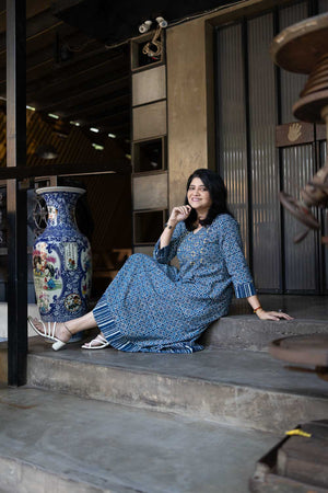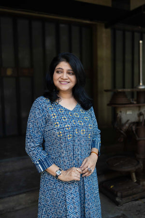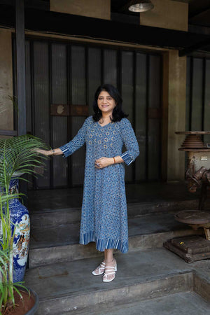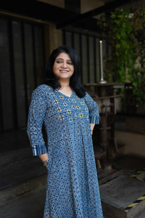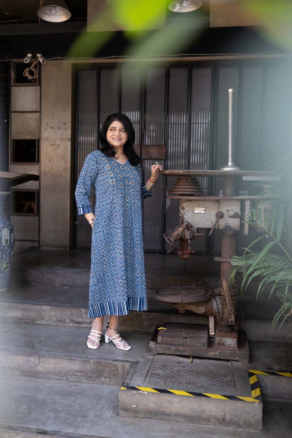 Our signature, Slub cotton Embroidered Indigo geometric hand block printed Dress cum Kurta. Pleat detailing in the front. It has a machine embroidery in the front to highlight. Striped slub cotton hand block printed fabric for the borders. Scallop work and machine work for the sleeves. 1 side pocket.