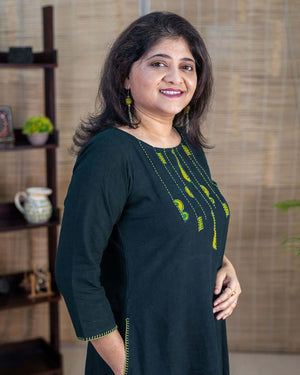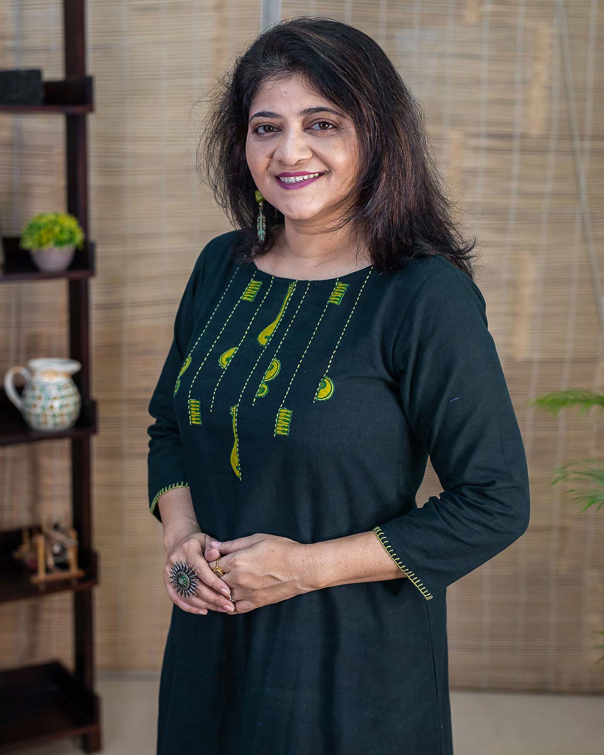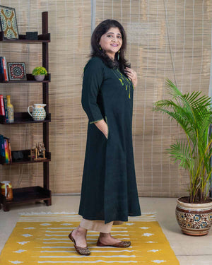 This is a special product – Exclusive a line dress cum kurta with our signature bandish musical block applique work with hand work in the front as well as on the sleeves & a pocket. Main fabric is pure cotton superior slub. 1 side pocket. Back opening.