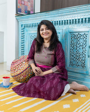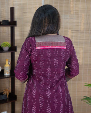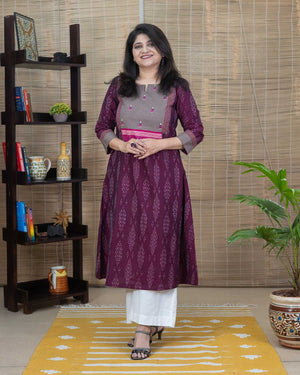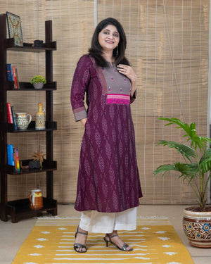 Rare color Magenta in ikkat, an exclusive weave Aline Kurta. Contrast Ilkal & sambalpur ikkat patchwork with borders in the front with hand and machine embroidery. Back pattern with Ilkal borders and hand work.