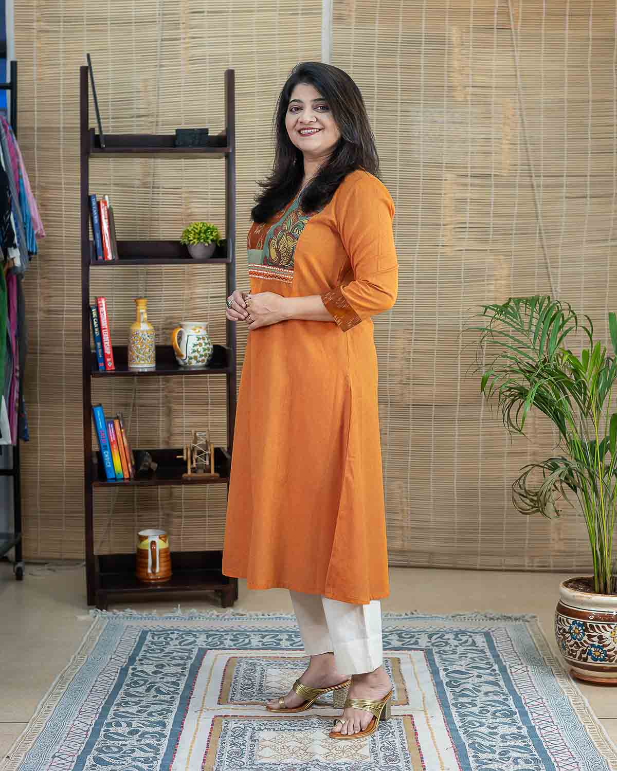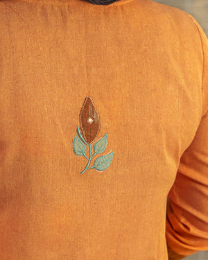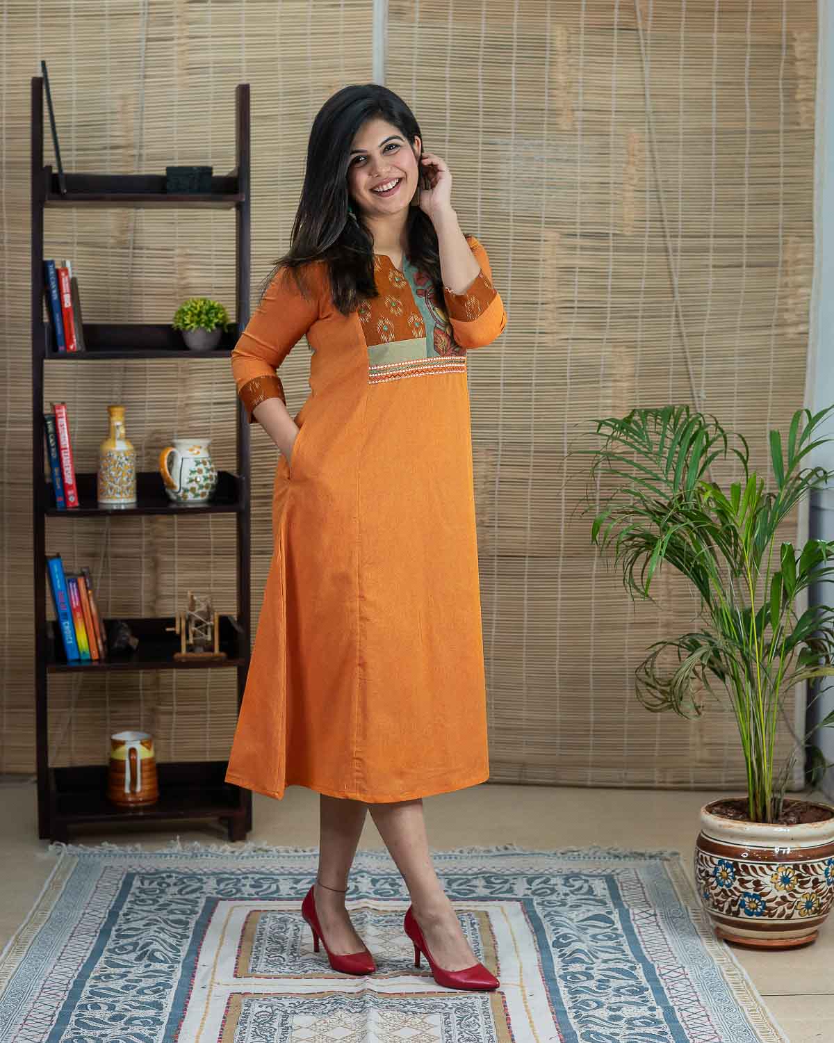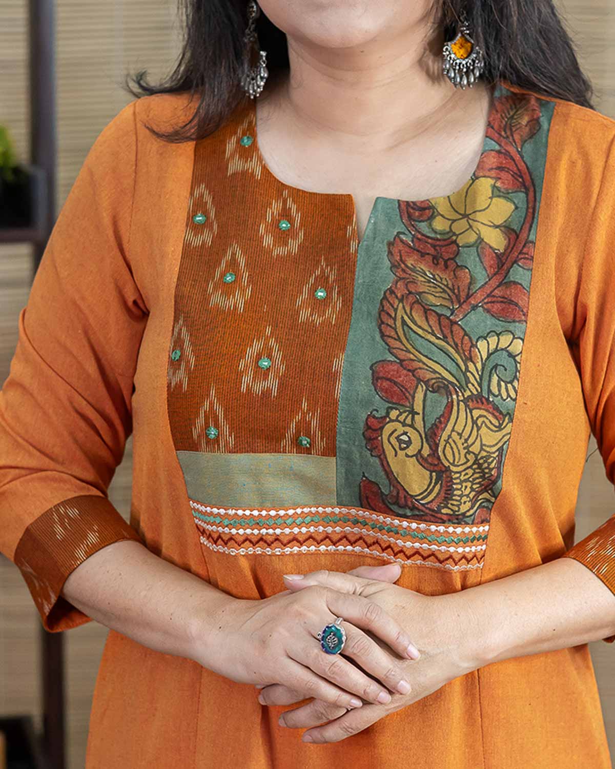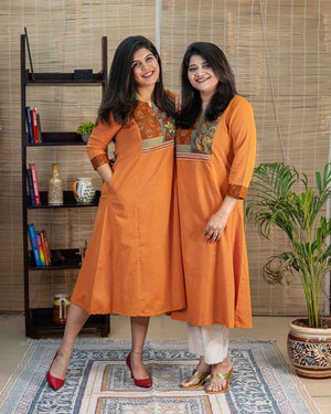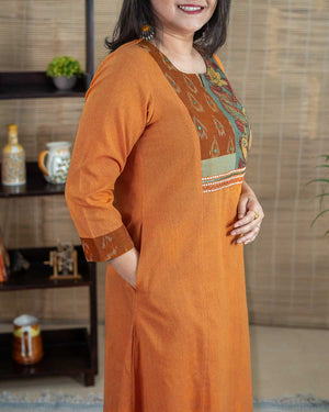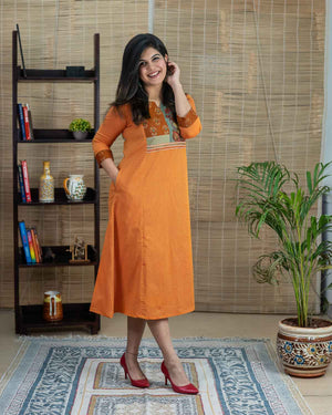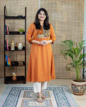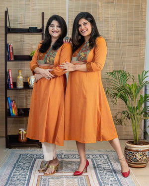 This is a special product – Exclusive a line dress cum kurta with rare find exclusive pen kalamkari (hand painted kalamkari from Srikala Hasti) and ikkat and contrast yellow front pattern with embroideries. Main fabric is pure cotton in elegant orange (its not flashy). Sleeves with hand work stich line detailing. 1 side pocket. Hand work and machine embroidery to highlight. Back pattern including machine handwork & applique work.