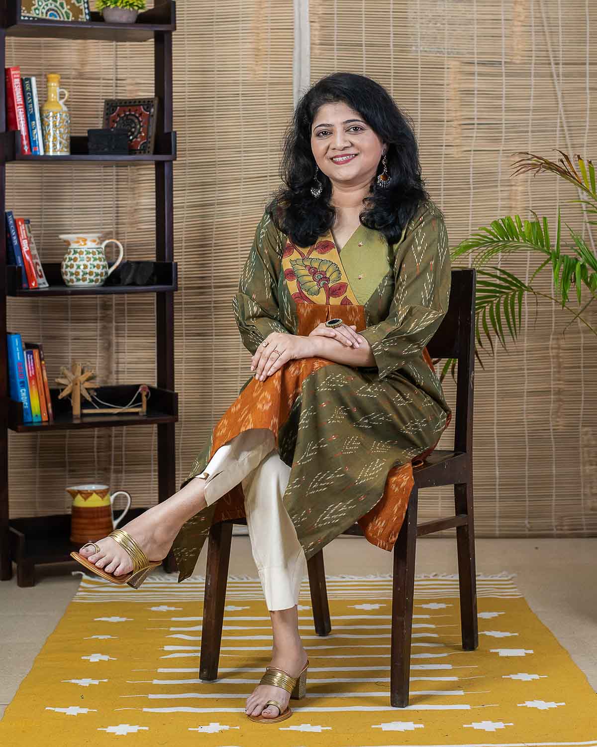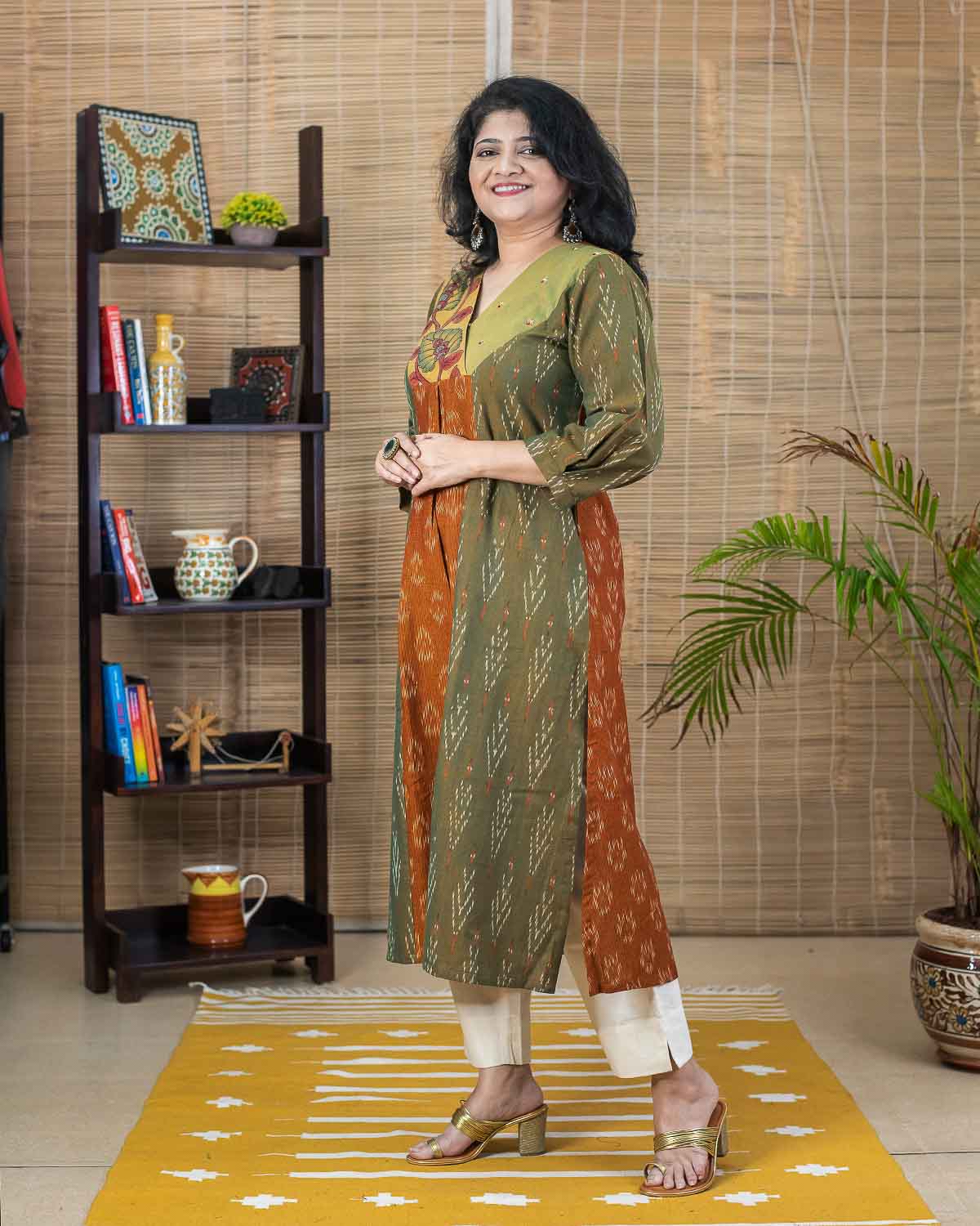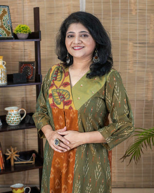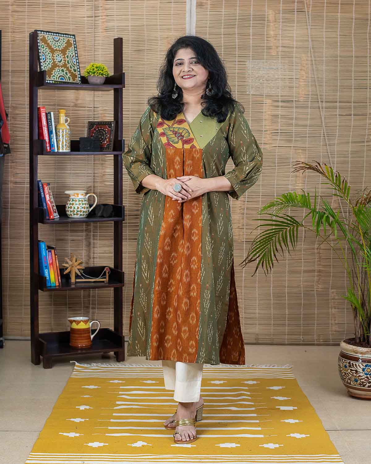 This is a special product – Exclusive a line kurta with side slits. Rare find exclusive pen kalamkari (hand painted kalamkari from Srikala Hasti) and applique work with hand and machine embroidery. Main fabric is pure ikkat mercerized cotton. Sleeves with patterning. 1 side pocket. Back pattern including handwork & applique work.