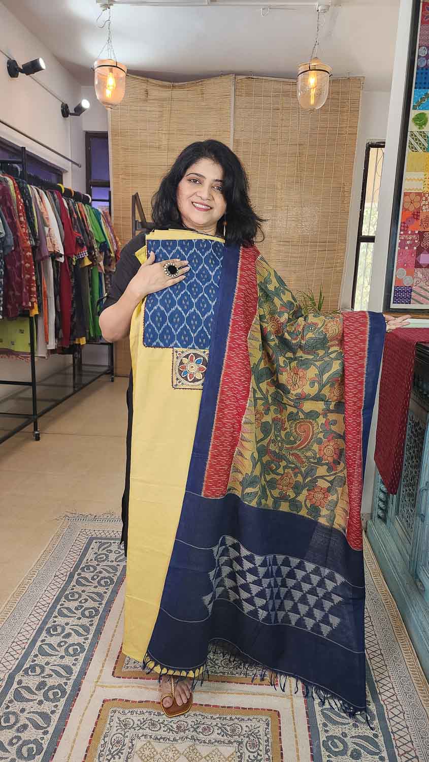 Specially curated Ikkat Pen kalamkari (Hand painted kalamkari from ShriKalahasti) hand crafted dupatta with exclusive signature patterned kurta fabric.