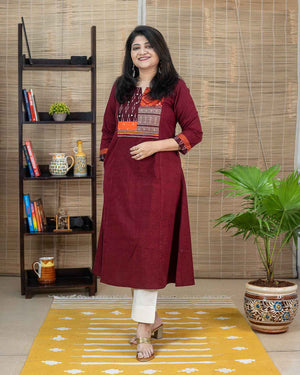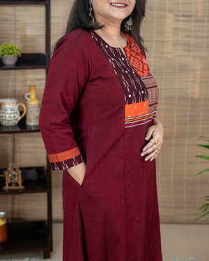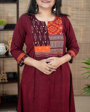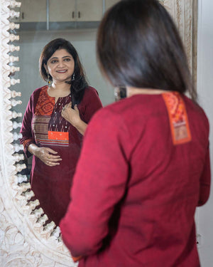This is a special product – Exclusive a line dress cum kurta with rare find exclusive handwoven ikkat from Sambalpur & Telangana with zari borders. Bandhej from Gujrath for the front patch. Main fabric is pure ikkat cotton. Princess cut in the front. Sleeves with ikkat and contrast plain borders with stich line detailing. 1 side pocket. Hand work and machine embroidery to highlight. Back pattern with ikkat and zari border.
