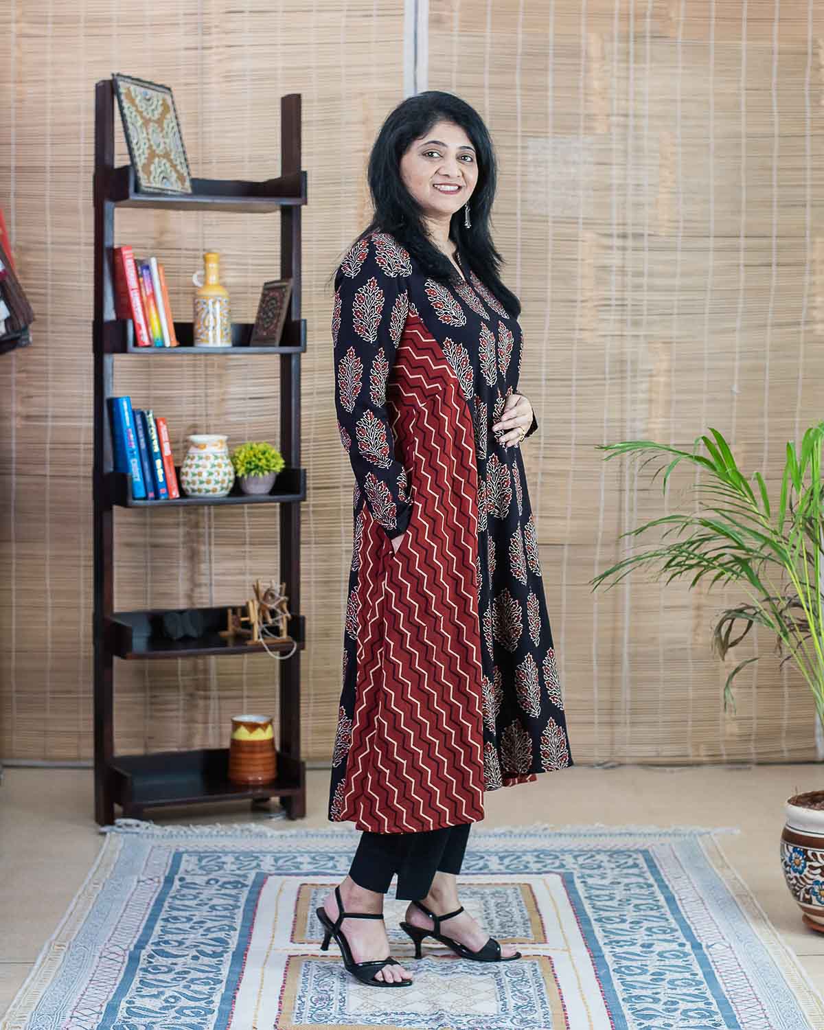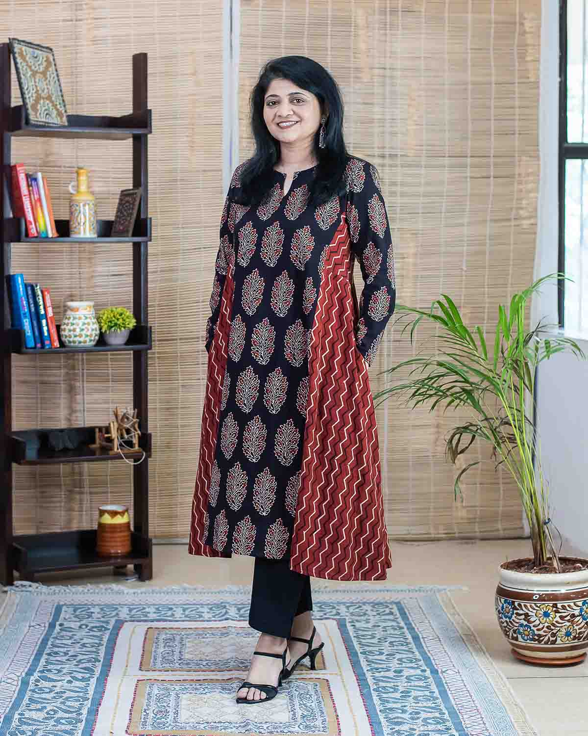 Red Black Ajrakh hand block printed long dress/kurta with two side pockets. Relaxed fit, flare with 2 ajrakh prints used for the patterning in the front, back and sides. For selecting the size, please check chest size.