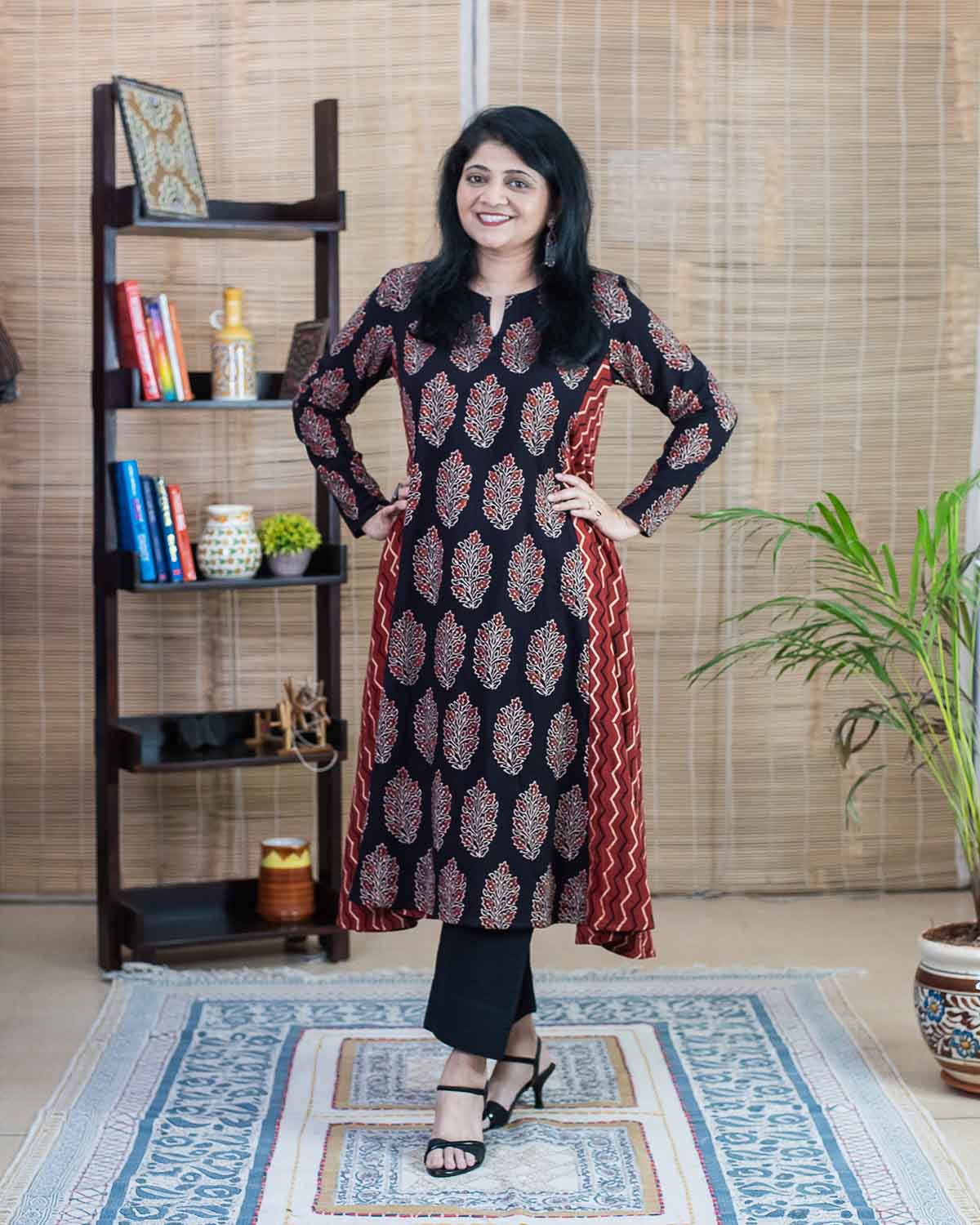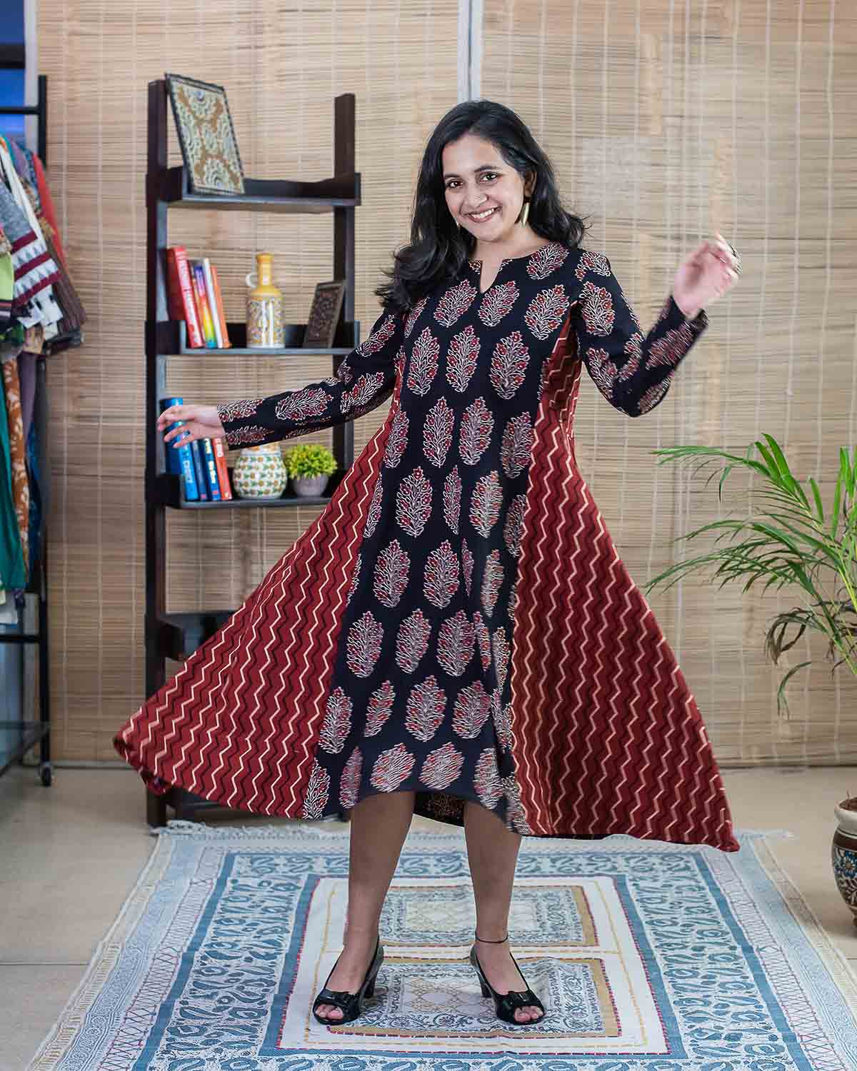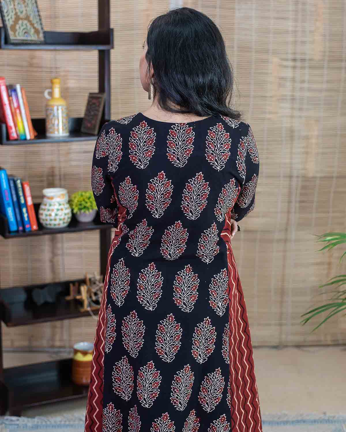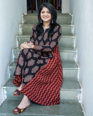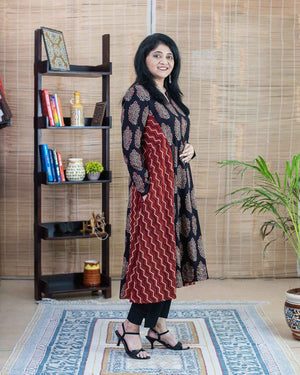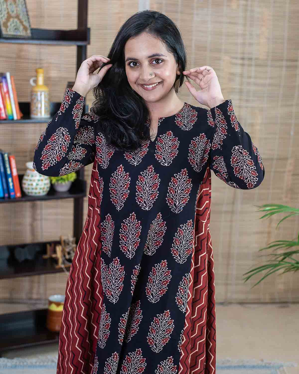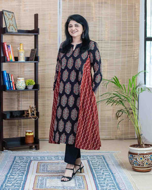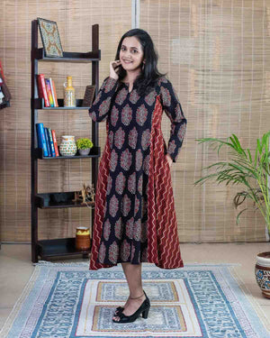 Flared Ajrakh Red black dress / kurta - Relaxed fit