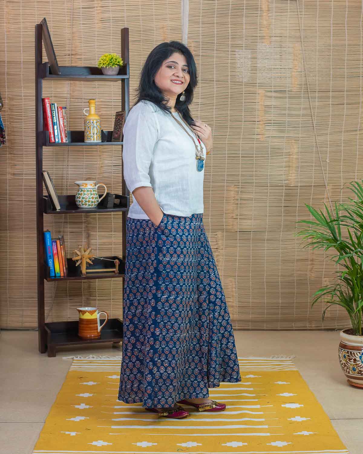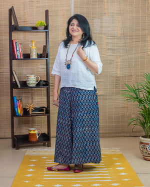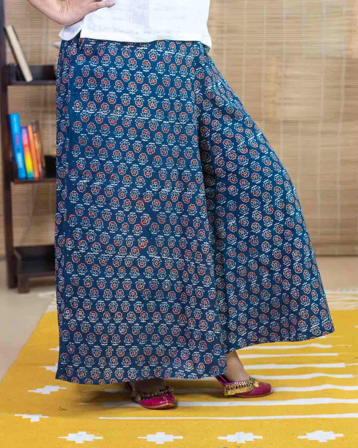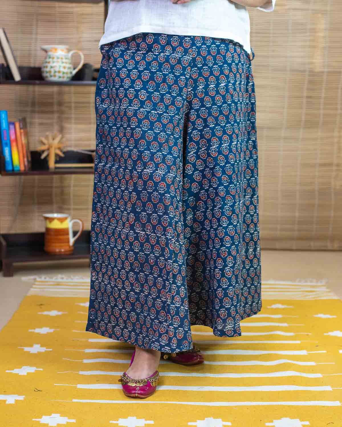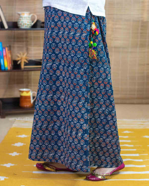 Indigo floral Ajrakh hand block printed flared bottom wear. 1 Side pocket in the right side, Tassels with knots on left side. Summer special. Pair it with a short tops/t-shirts or crop tops. Elastic in the back.