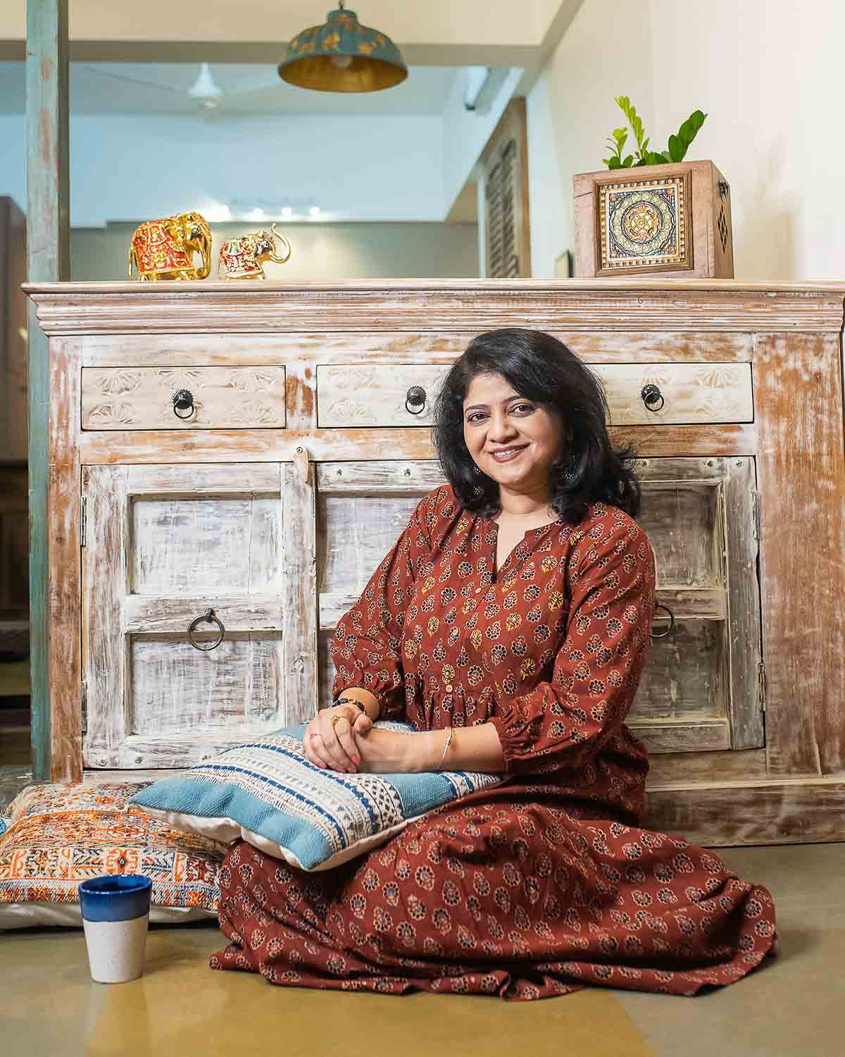 Summer special - Relaxed fit long, tiered dress . Pure ajrakh hand block printed cotton with hand embroidery to highlight in the front half body. 1 side pocket. Wooden buttons. 3/4th sleeves with elastic.