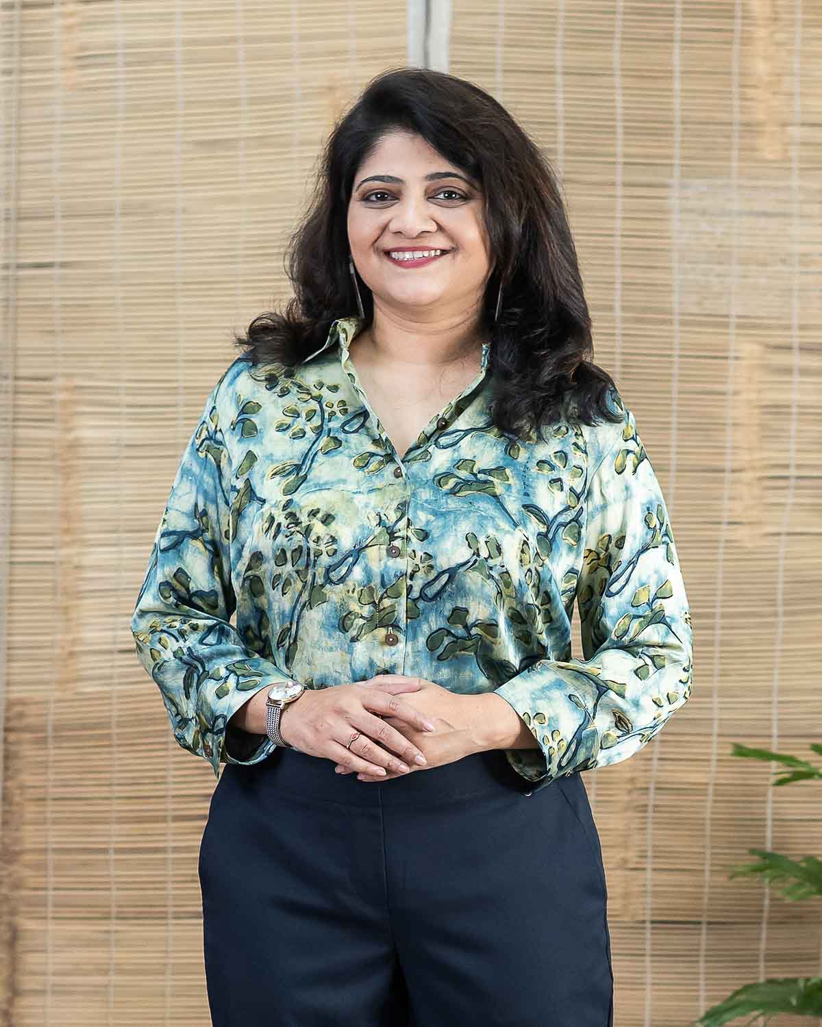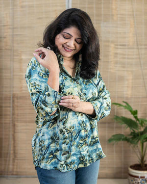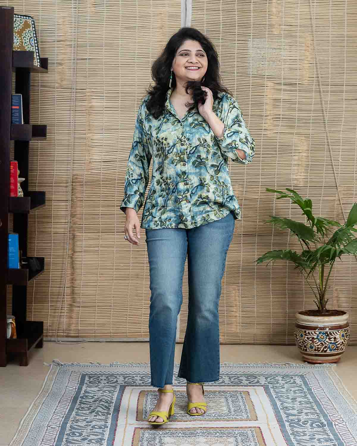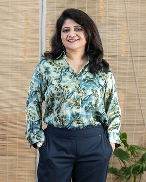 Exclusive Modal silk Greenish/Indigo indigo shirt. Its without lining very comfortable. Can be used as a formal wear or casual wear. Slight Color variation is expected in each batch of fabrics as the process of hand block printing is highly dependent on the amount of sun exposure.