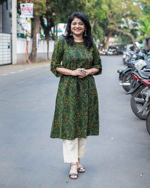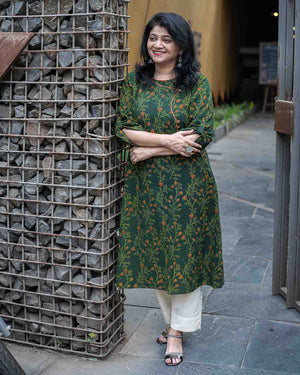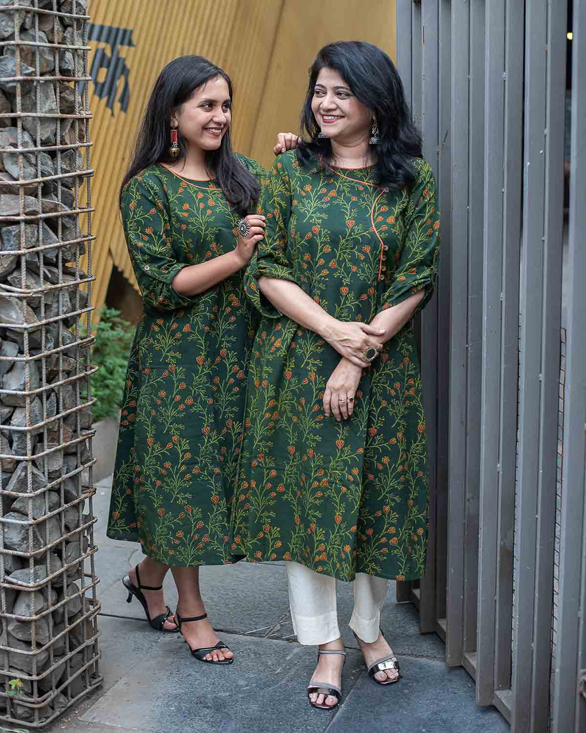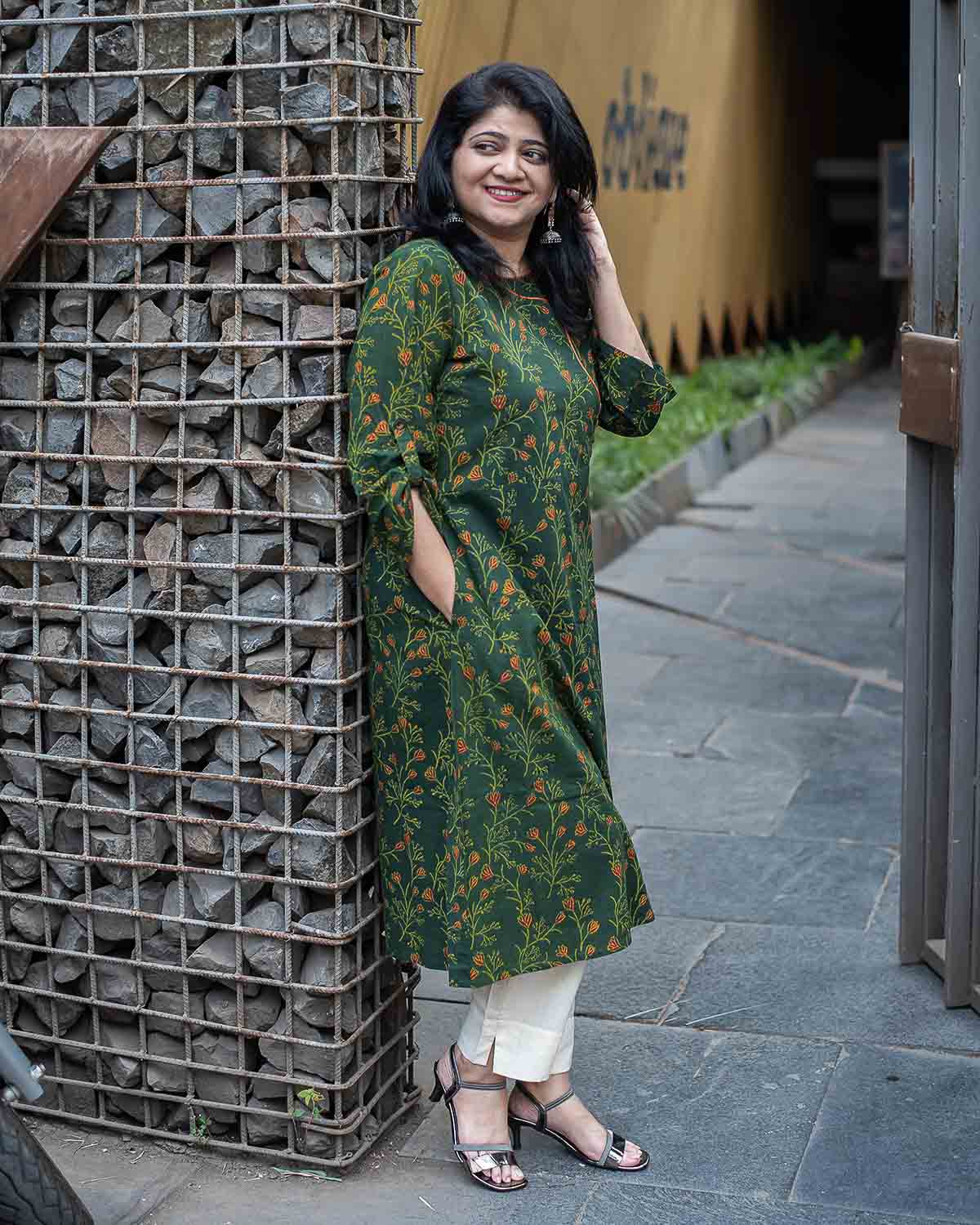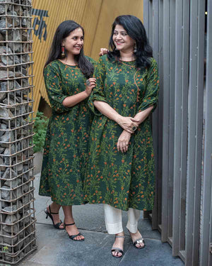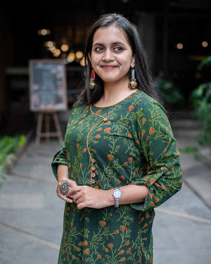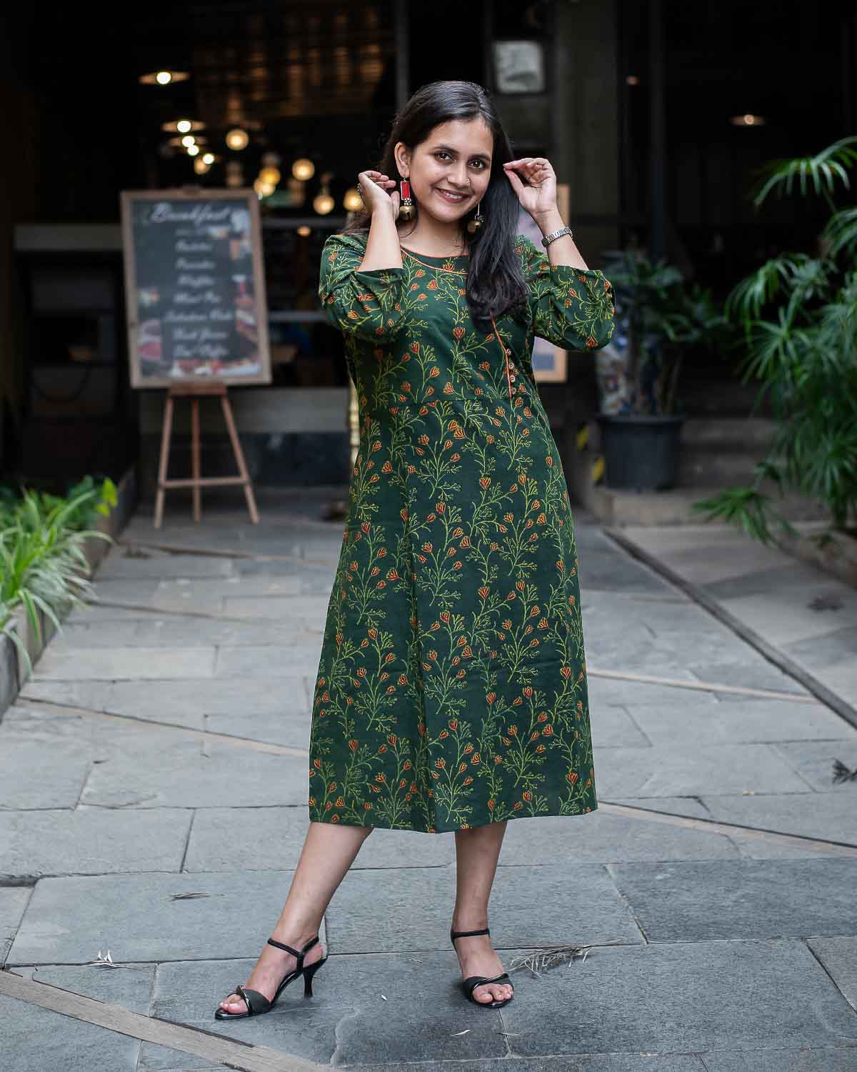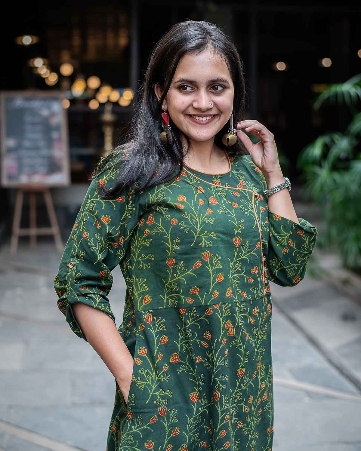 Ajrakh Green Dress cum Kurta with orange piping & wooden buttons pattern in the front. Patterned 3/4th sleeves.