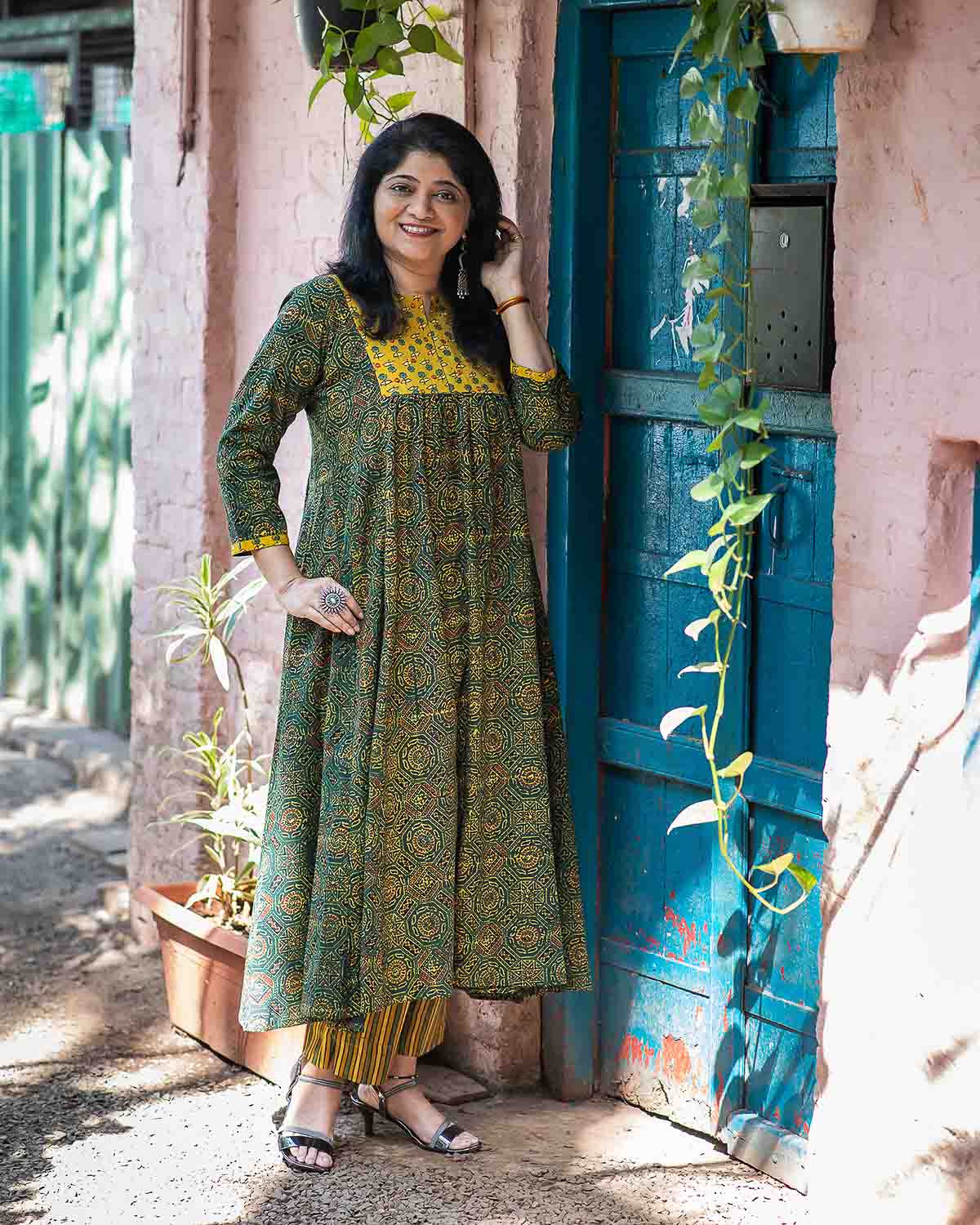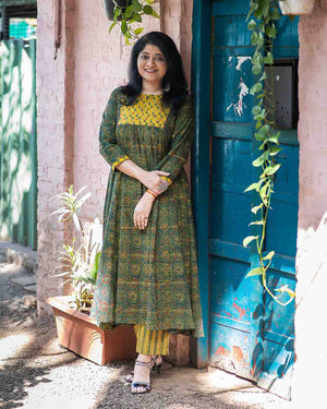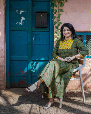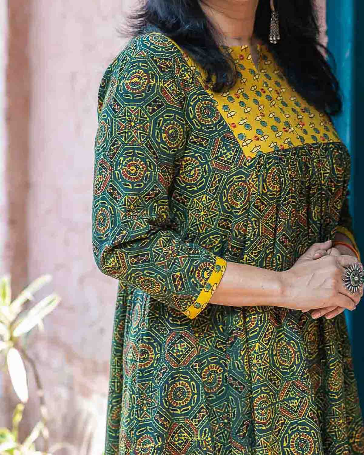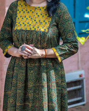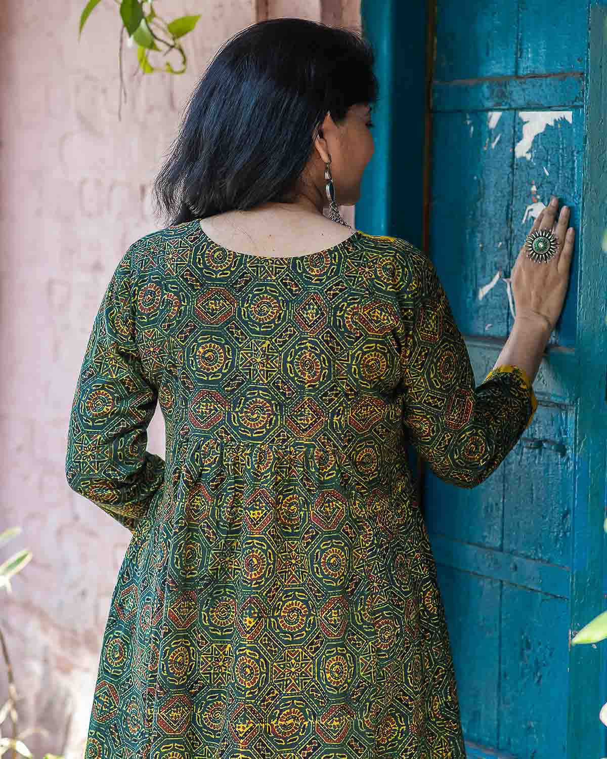 Green Embroidered Ajrakh with flare Dress cum Kurta