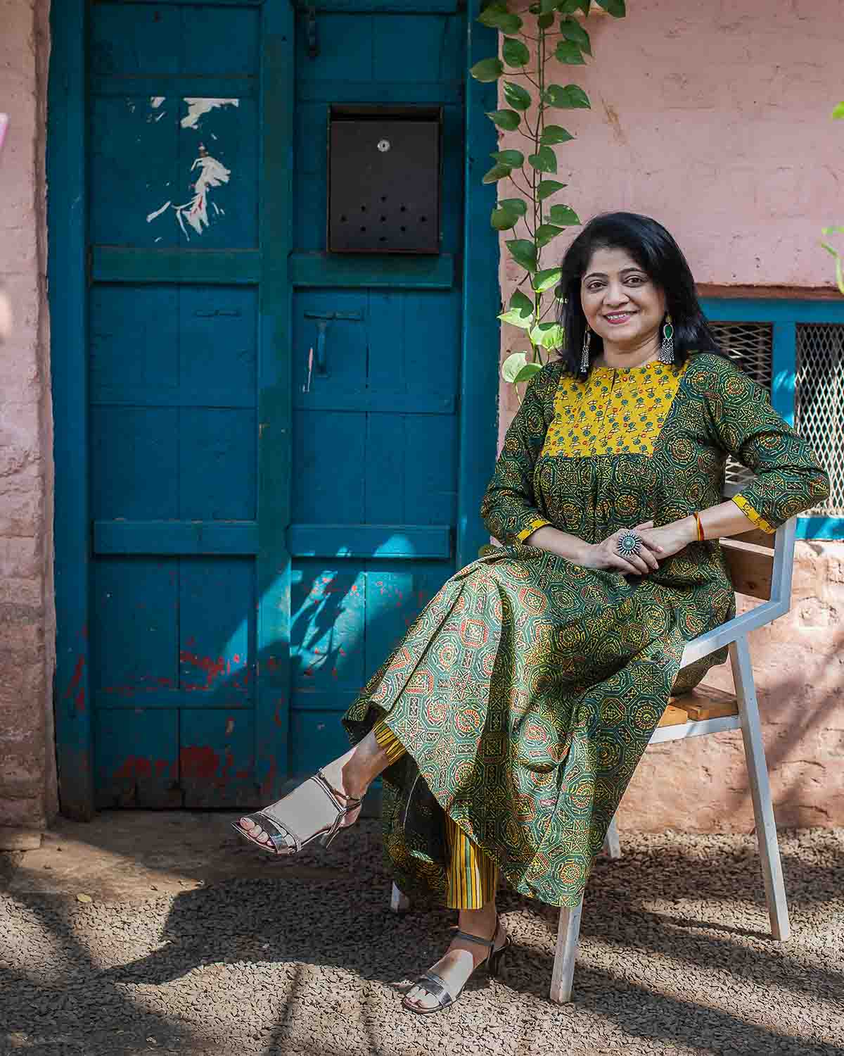Comfortable yet trendy design. Ajrakh hand block printed Dress cum Kurta. It has a geometric & floral motif. Contrast highlighting embroidery on front yellow ajrakh patchwork. 1 side pocket. Back has a flare which gives an extra comfort.