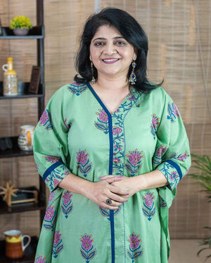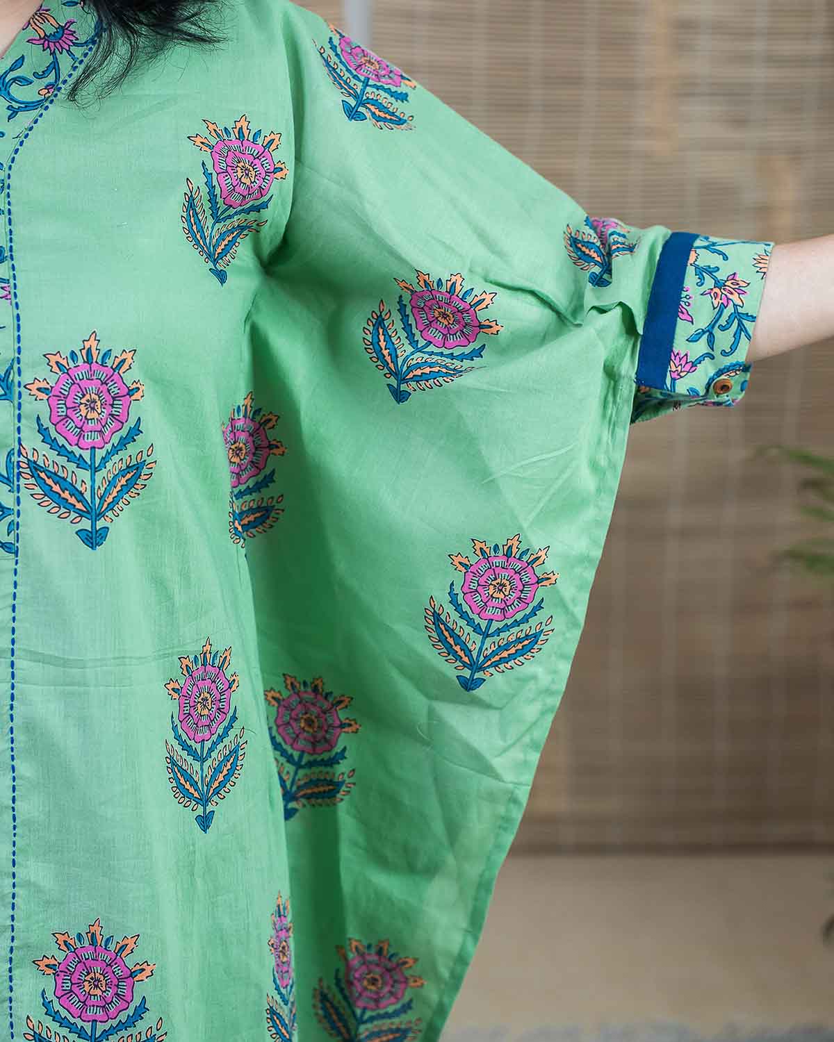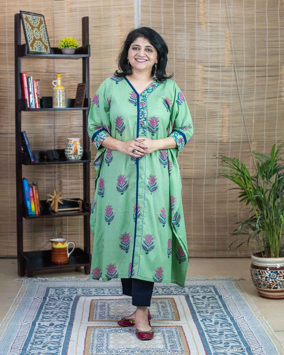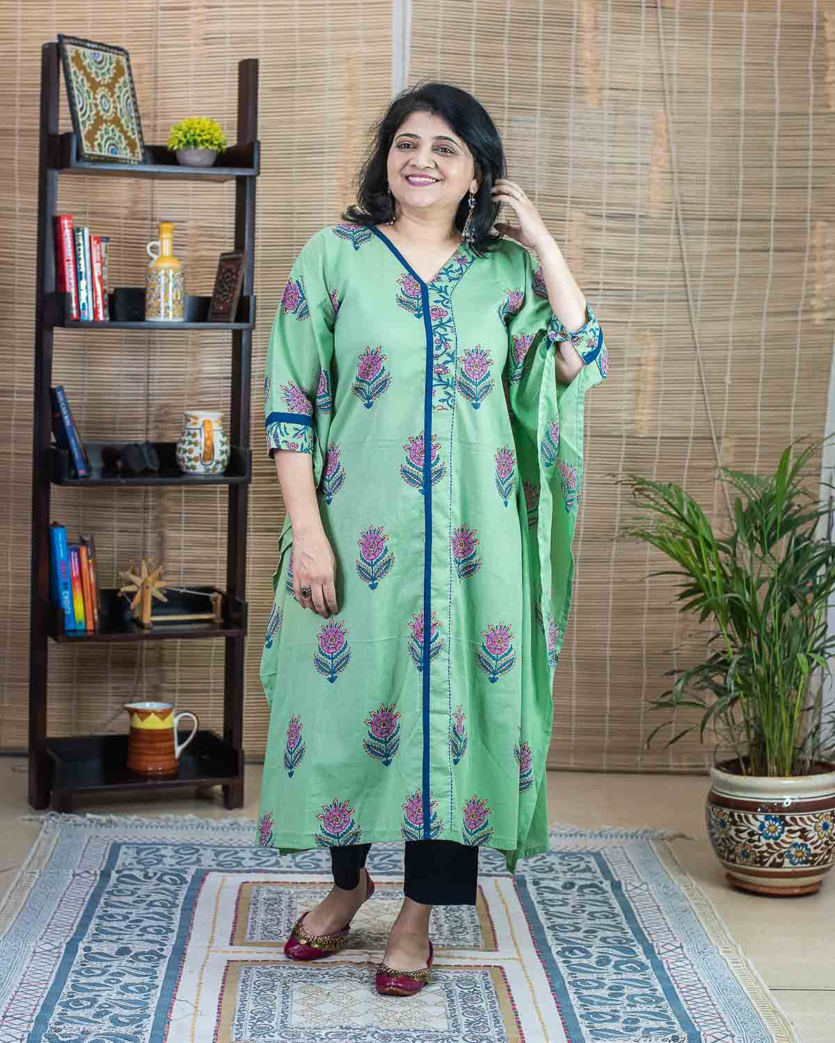 Light green mughal butta hand block printed kaftan. Sleeve detailing with contrast piping and stich detailing.