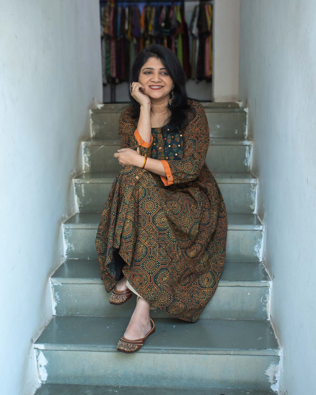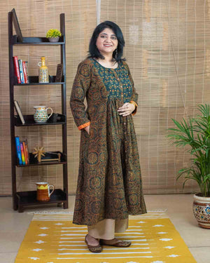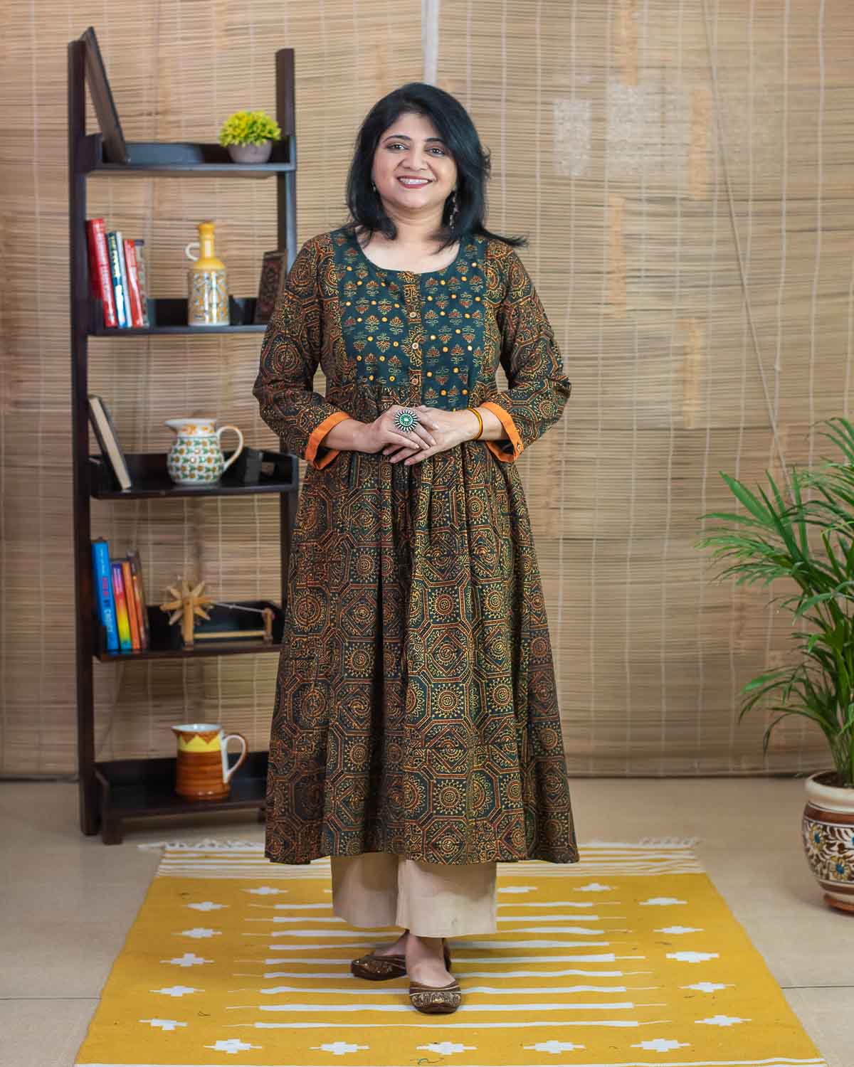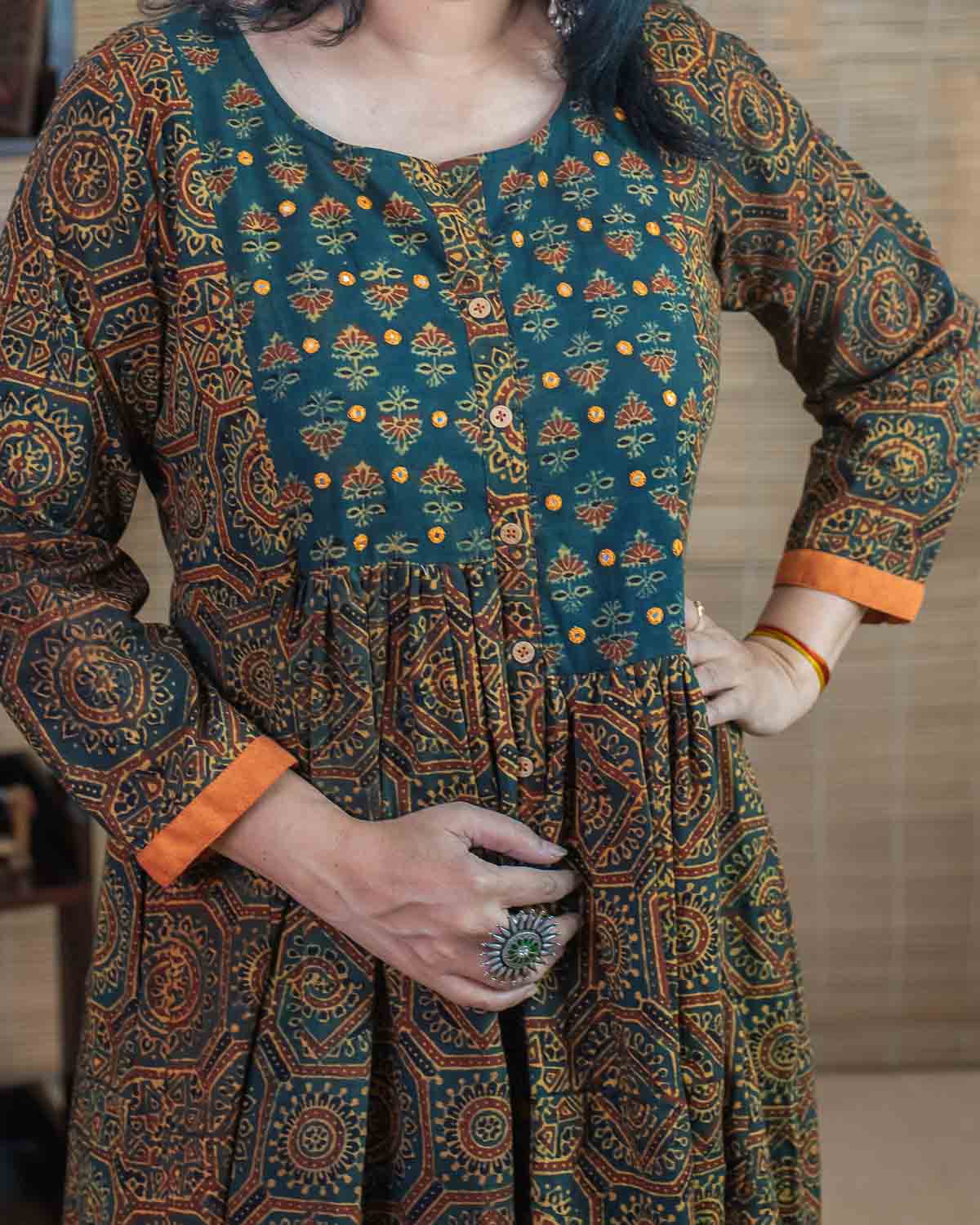 Green Orange mirror work Ajrakh Dress cum Kurta