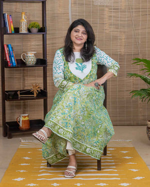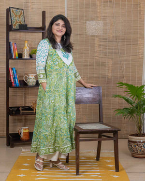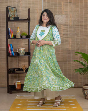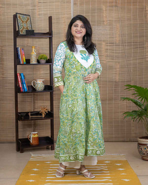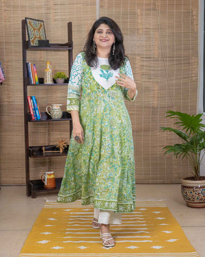 "सुती" Green Soft Cotton Anarkali with machine & hand embroidery
