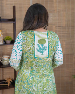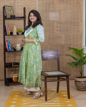 Designer Green soft cotton hand block printed Kalidar / Anarkali. Delicate machine embroidery for the front pattern. Hand work to highlight front mughal butta. Mughal butta on the sleeves and the back with borders on the sleeves. 1 side pocket.