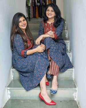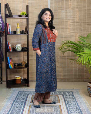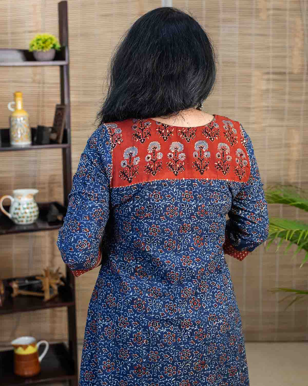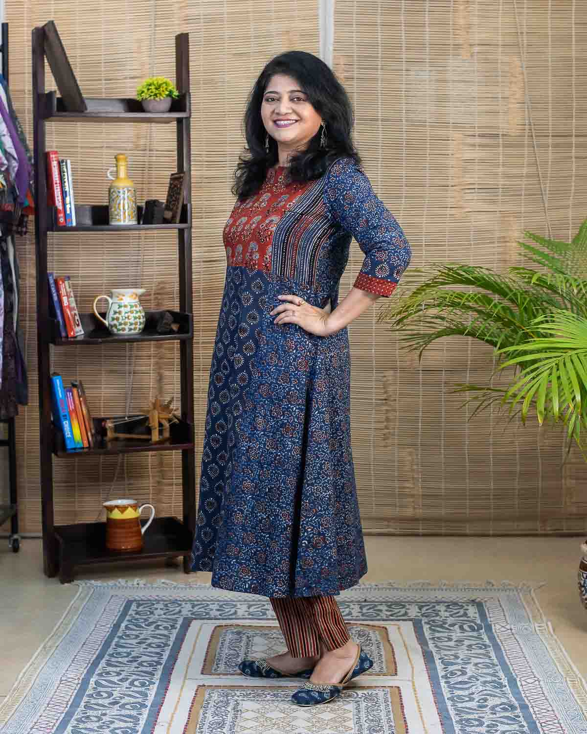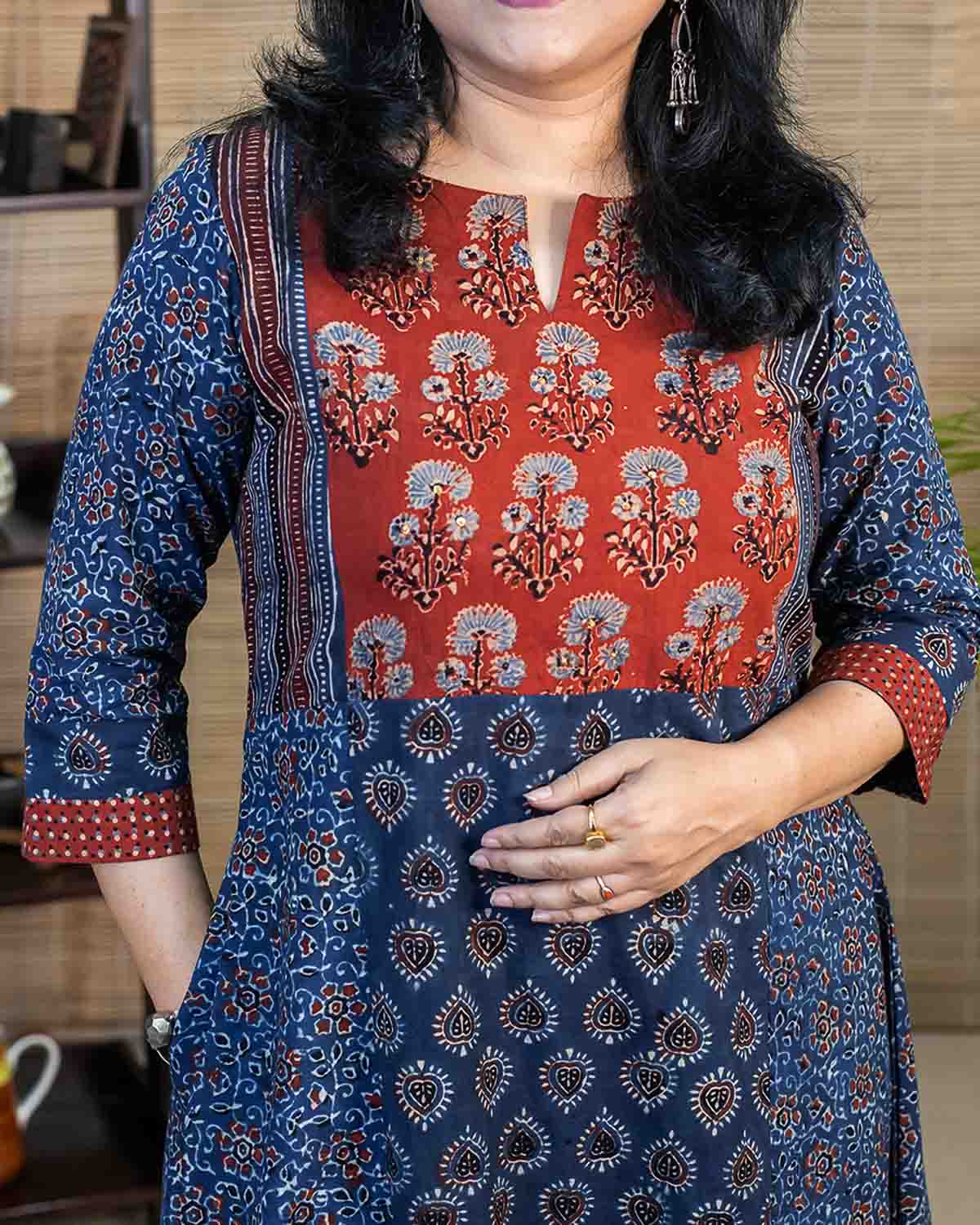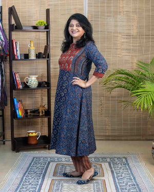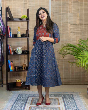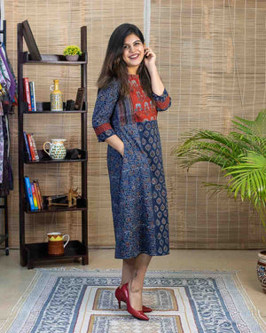 Product made from pure cotton ajrakh fabric in indigo color. Dress/kurta with one side pocket. Ajrakh patchwork pattern in floral & geometric prints in the front and the borders for the sleeves. Highlighted with hand embroidery in the front. Back patch with hand work kantha and sequin work.