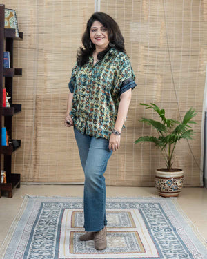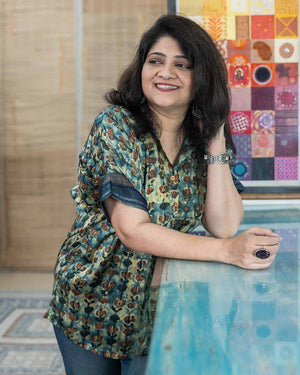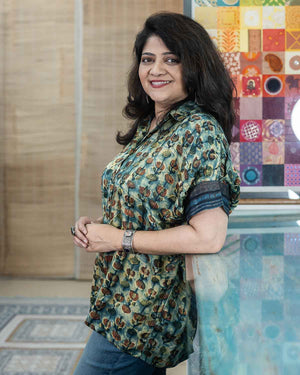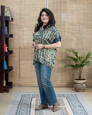 Exclusive Modal silk short kurta with a loose fit. Casual/Party wear. No shoulders. Sleeves with a pleats pattern and with a geometric modal silk border to tighten the fit at the sleeves. Extremely comfortable fabric & the fit.