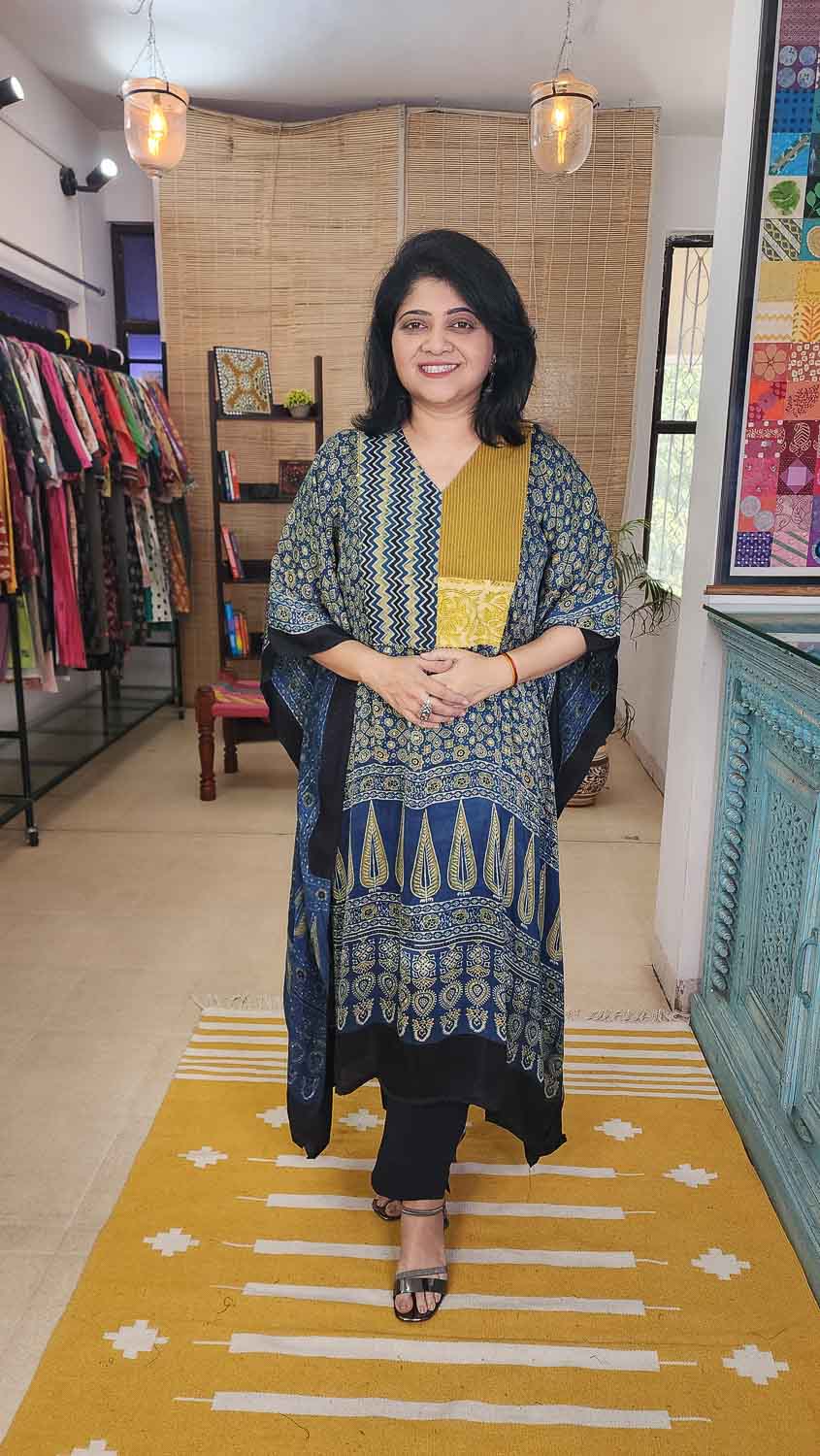 This is a special product – Exclusive designer Modal silk hand block printed Kaftan with a unique pattern of handblock printed patchwork in front highlighted with kantha sequin work.