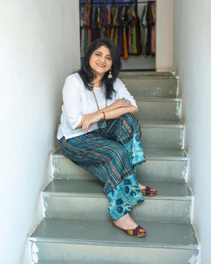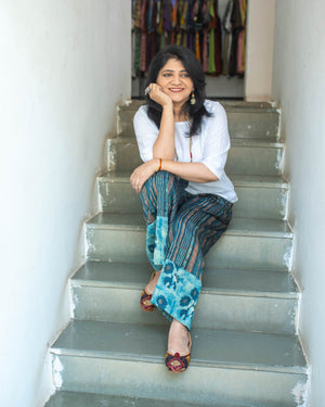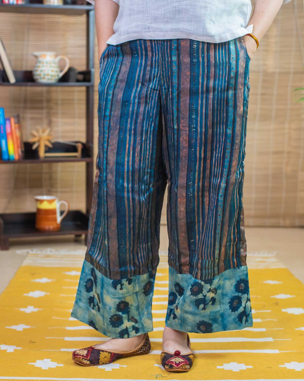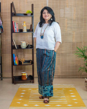 Exclusive and Elegant hand block printed Trouser in Modal silk. With 2 pockets. It is a unique design in itself. Plus, our cool and comfortable pattern makes it great for any occasion. It comes with a lining. Elastic in the back, string to adjust in the front.