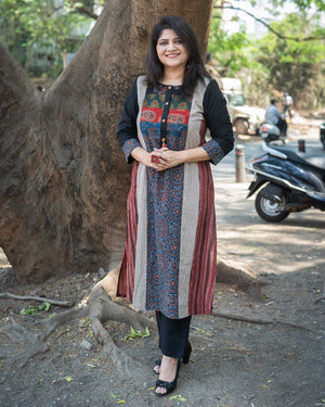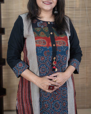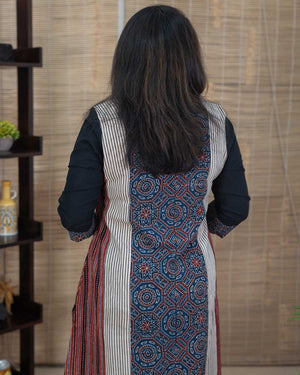 In-house designed Ajrakh patchwork hand block printed, the most comfort fit, A line Kurta with side slits. It has a geometric & floral hand block printed Ajrakh fabric pattern in the front and the back with patchwork. 1 side pocket. Ethnic tassel in the front. Black ikkat (handwoven) plain fabric for the sleeves. Ajrakh red border for the sleeves.