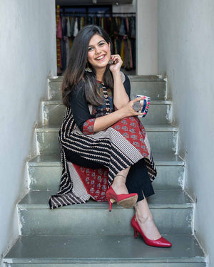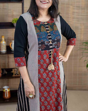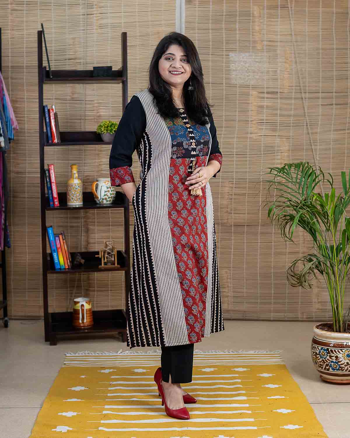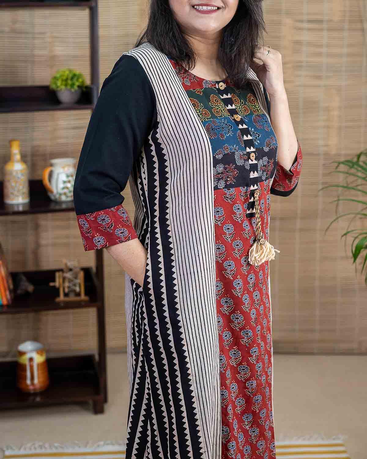 In-house designed Ajrakh patchwork hand block printed, the most comfort fit, A line Kurta with side slits. It has a geometric & floral hand block printed Ajrakh fabric pattern in the front and the back with patchwork. 1 side pocket. Ethnic tassel in the front. Black ikkat (handwoven) plain fabric for the sleeves. Ajrakh red border for the sleeves.