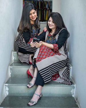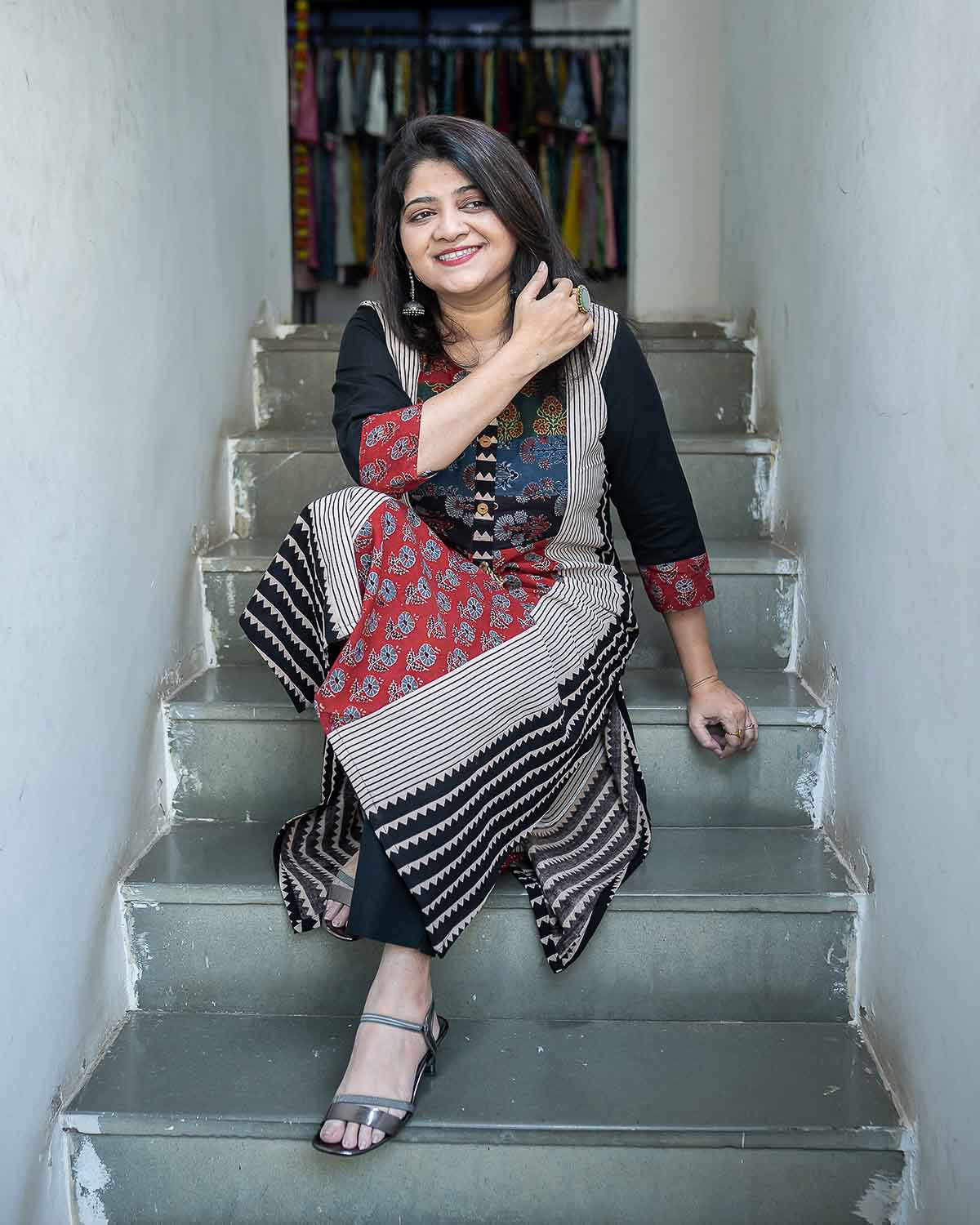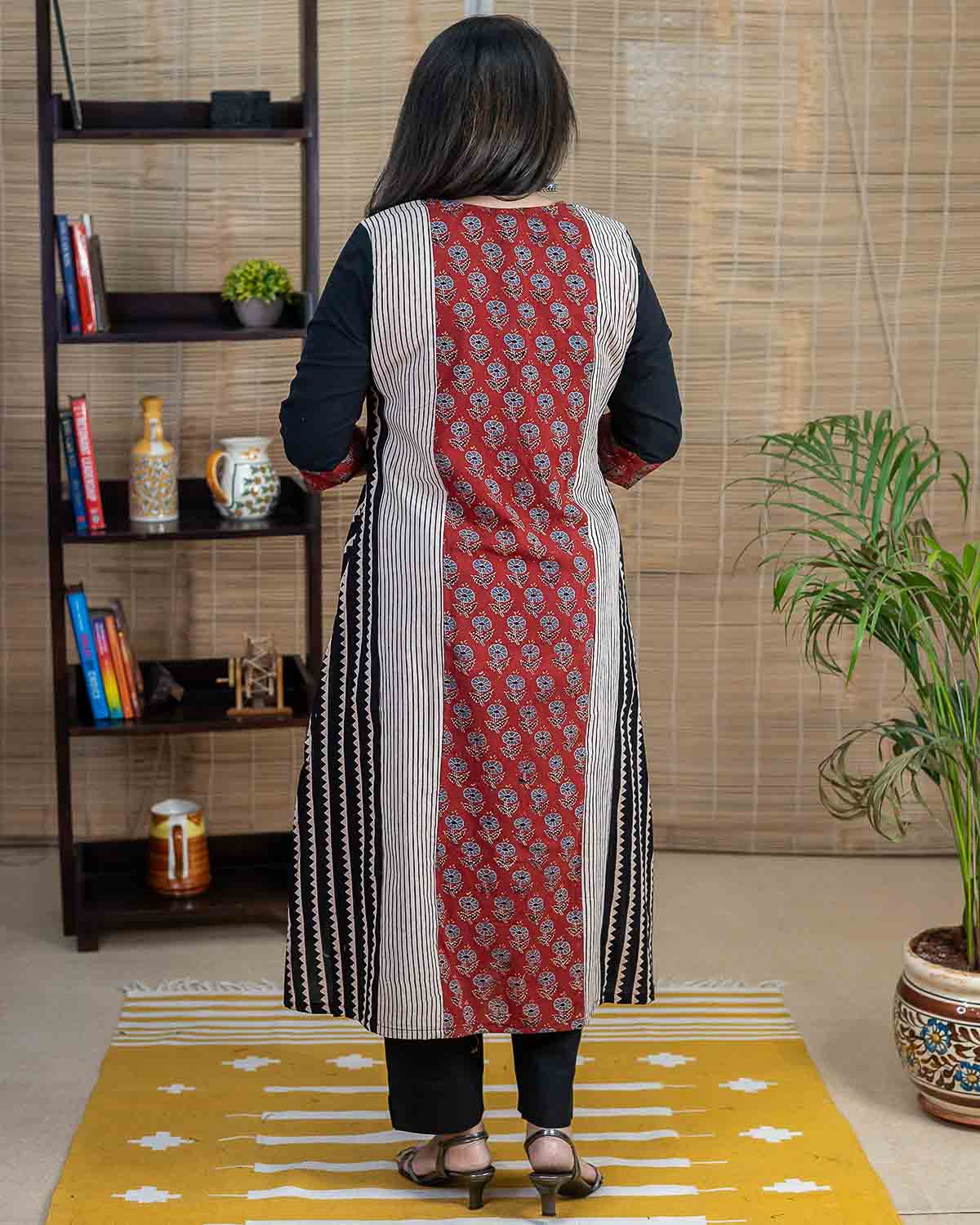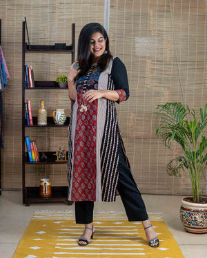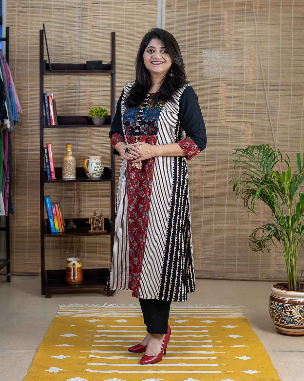 In-house designed Ajrakh patchwork hand block printed, the most comfort fit, A line Kurta with side slits. It has a geometric & floral hand block printed Ajrakh fabric pattern in the front and the back with patchwork. 1 side pocket. Ethnic tassel in the front. Black ikkat (handwoven) plain fabric for the sleeves. Ajrakh red border for the sleeves.