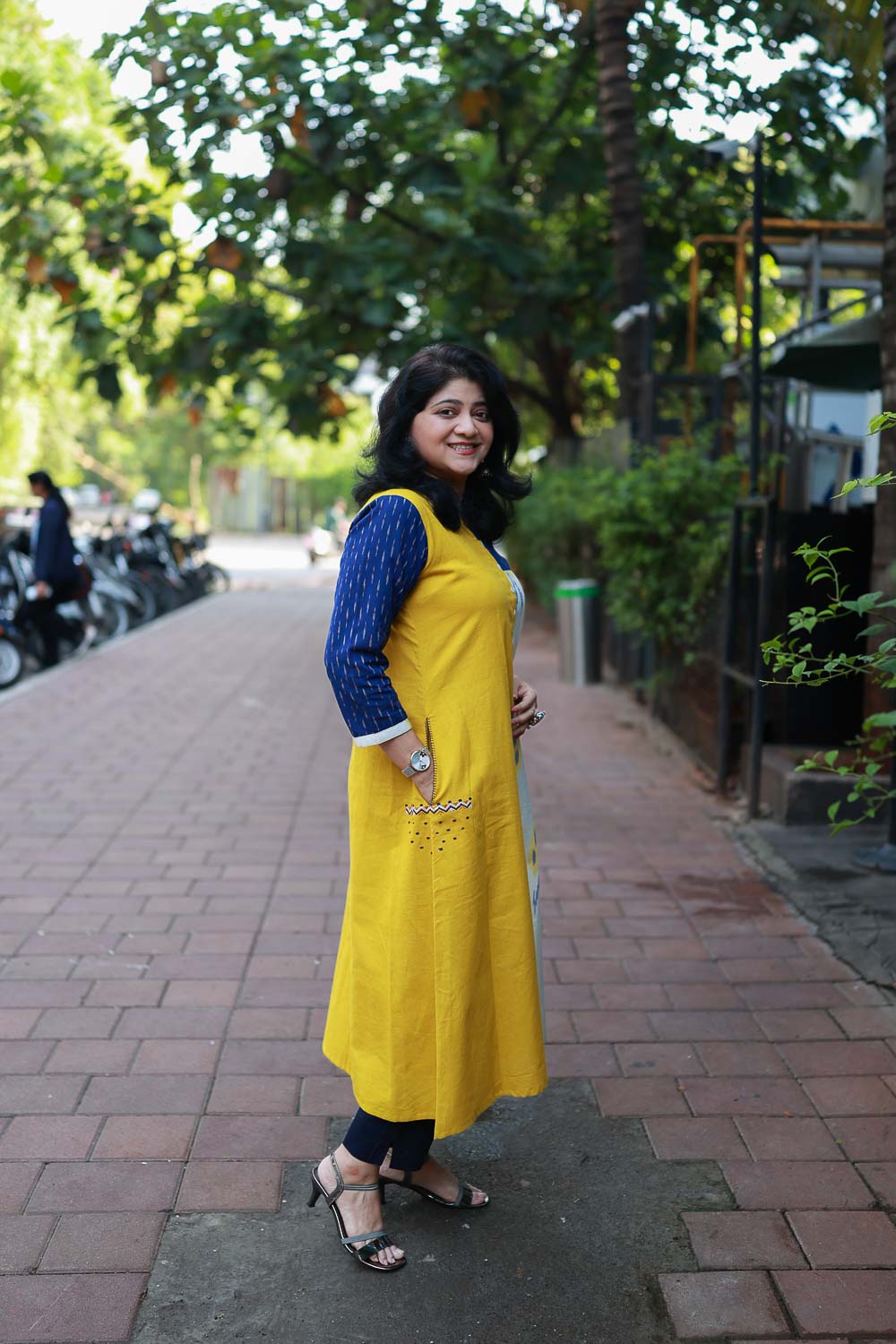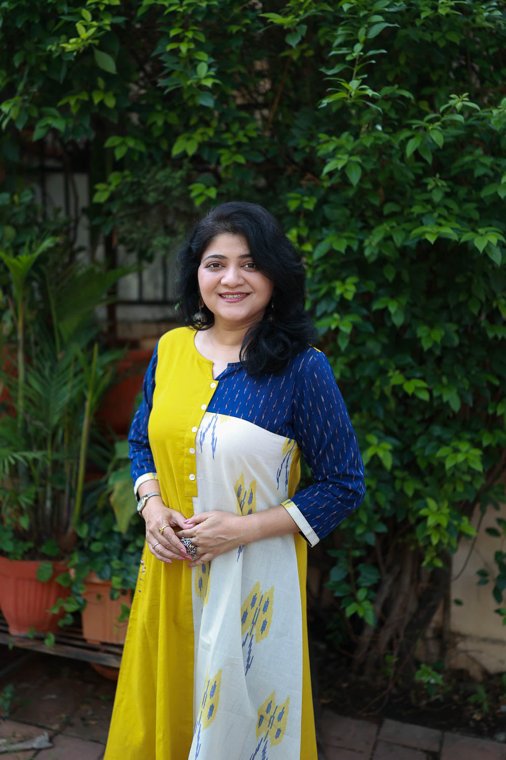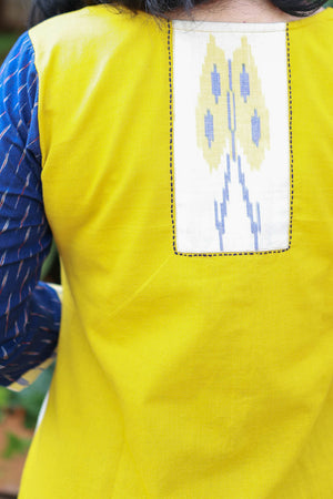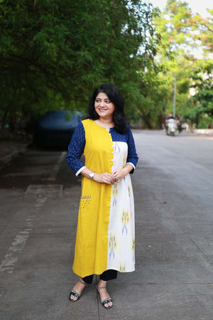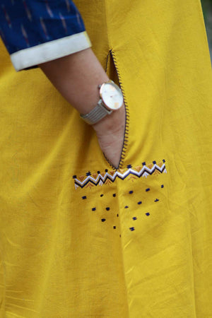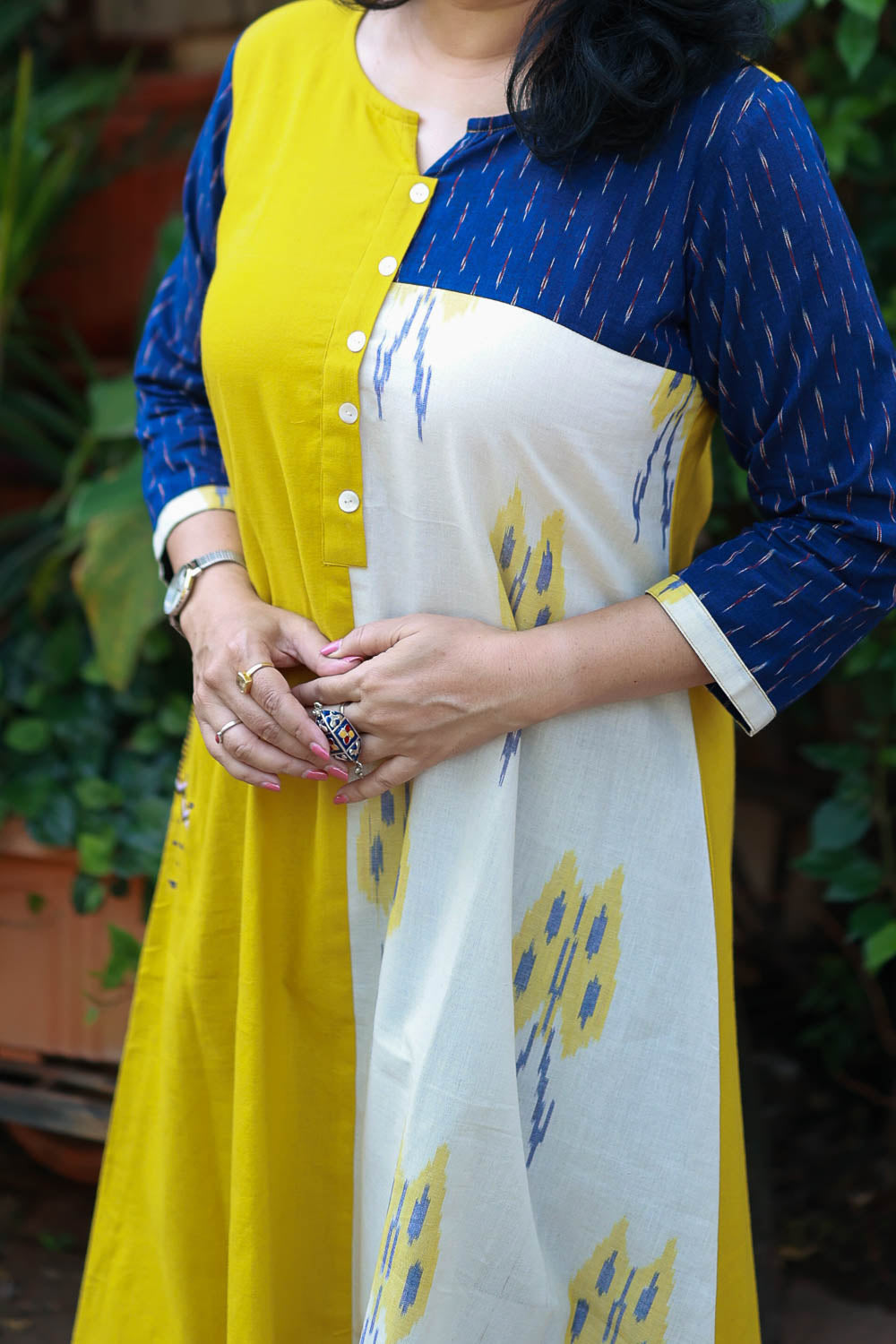 This is a special product – Exclusive a line dress cum kurta with rare find exclusive ikkat weaves. Base fabric is mustard ikkat fabric (count of this woven fabric is same as ikkat woven fabric) with exclusive ikkat weaving in cream and multicolor motif. Detailing in the front and back highlighted with embroidery. Indigo ikkat sleeves. 1 side pockets with hand and machine embroidery around the pocket.