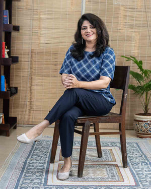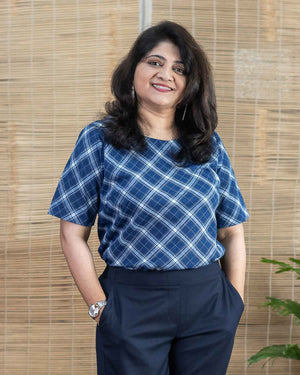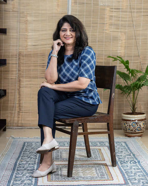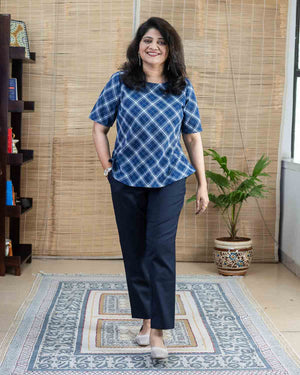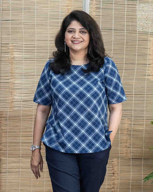 Pure cotton hand woven navy blue checkered short top with Sleeves Back opening with wooden button. This is a versatile top to pair it with all kinds of bottom wear.
