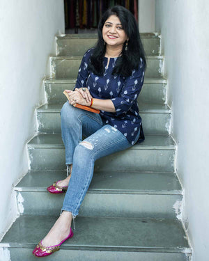 In-house designed. Wear this exclusive ikkat handwoven cotton short top with a fitted pant / jeans. Simple neckline, elegant dressing.