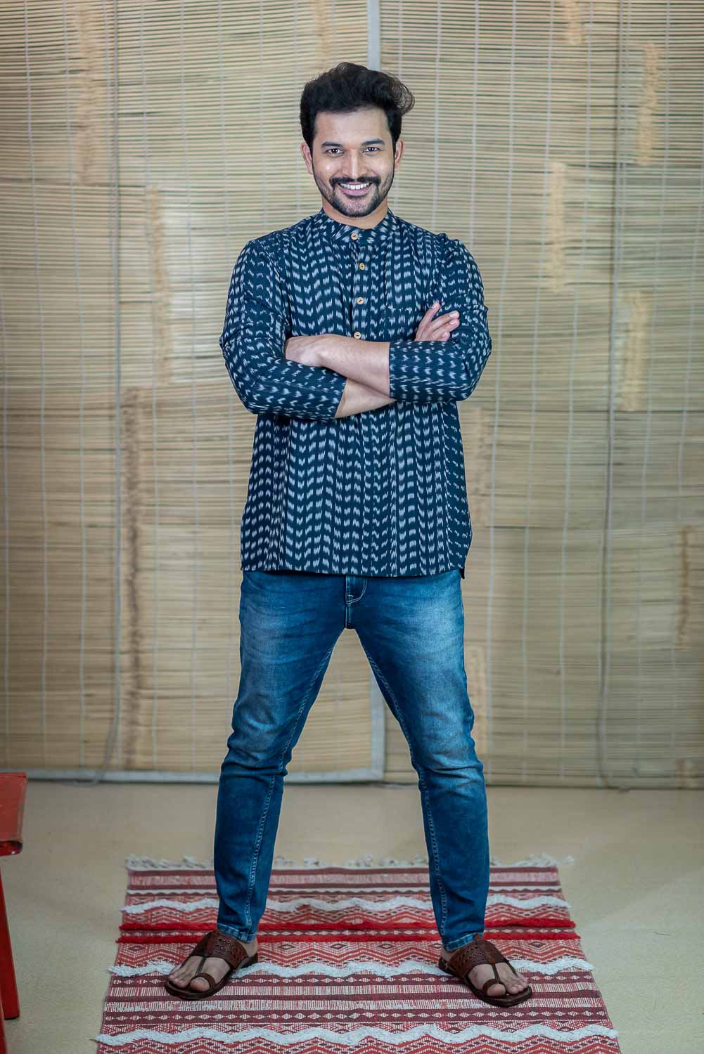 Navy Blue double ikkat exclusive cotton short kurta with wooden buttons.