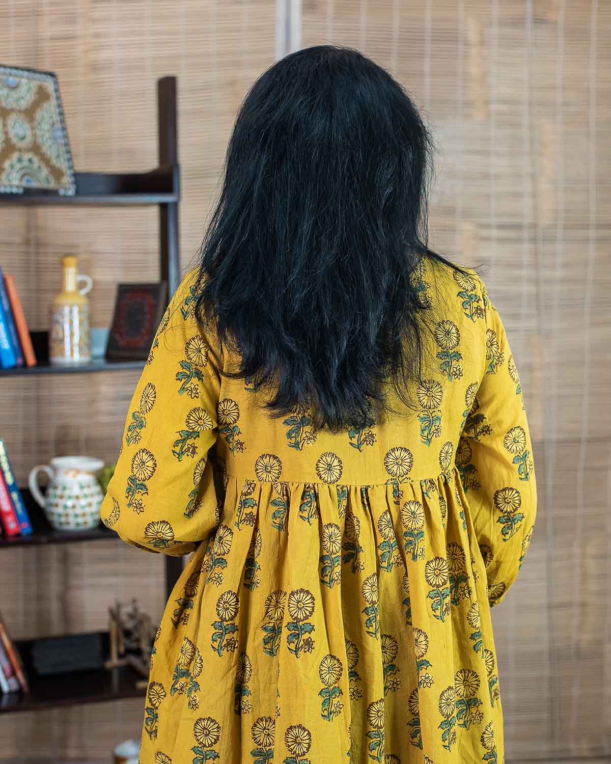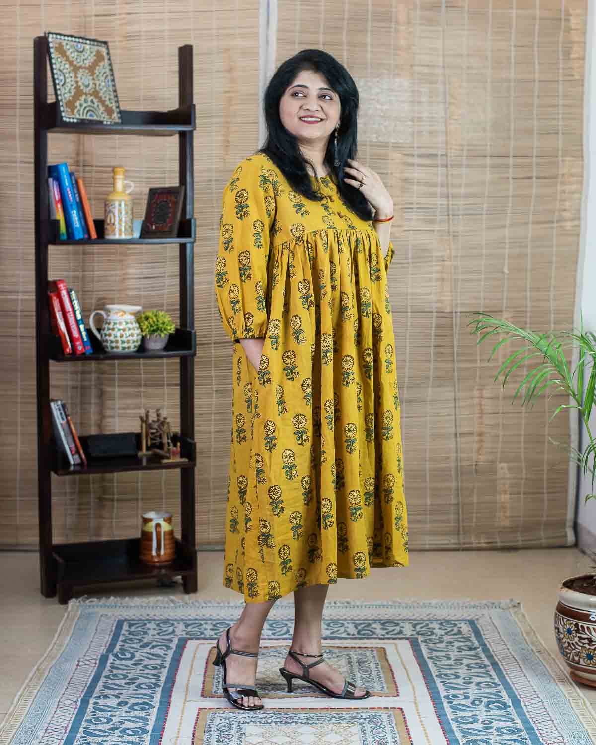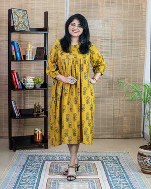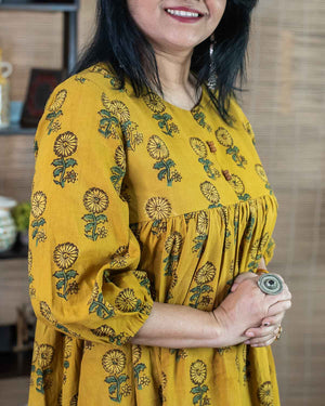 Yellow ajrakh hand block printed Long dress/kurta with two side pockets. Please note its a free size / no fit dress in the waist and seat measurements. For selecting the correct size, please check chest measurements. Please check the size chart. or contact us for choosing the size. No return / exchange as per the policy. Thank you.