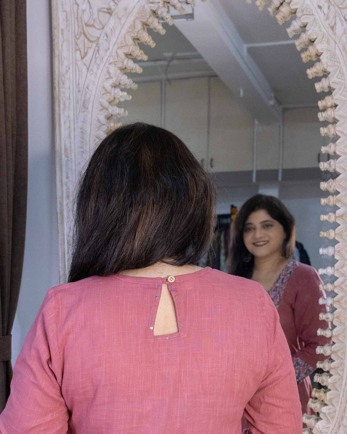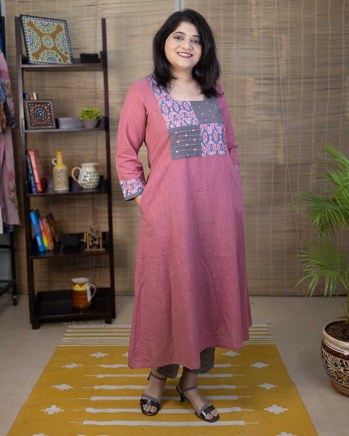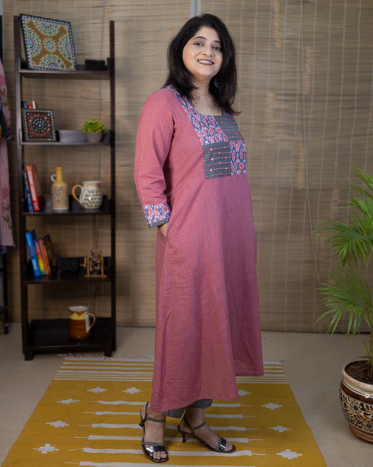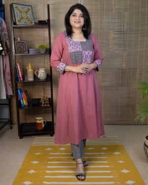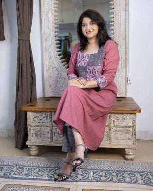 Specialty of this kurta is our signature slub cotton fabric in very unique pink color. Patterned with mercerized ikkat gray & pink hand-woven fabric. A line dress cum kurta with 2 side pockets. Machine embroidery in the front patch to highlight. 3/4th sleeves with ikkat border with hand work. Back pattern with opening.