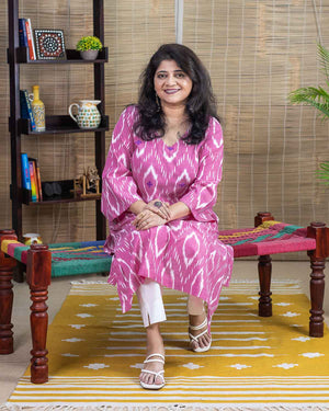 Alluring color pink in Ikkat with machine embroidery in the half body. Handwork around the neckline. A line kurta with side slits and side pockets. Bell sleeves. Matching trouser available as a separate product. This is a new fit introduced; continue to select the same size that you select from us for the comfort fit. Do check size chart below,