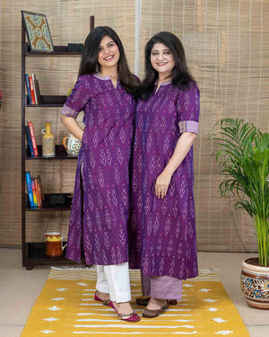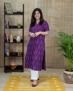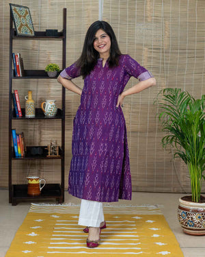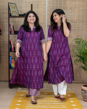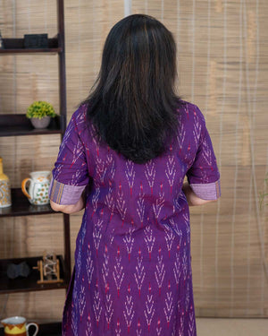 Rare color, Magenta in ikkat, an exclusive Aline Kurta with side slits. Contrast lavendar patterning around the neck and sleeves. Princess cut in the front back which gives a comfort fit.