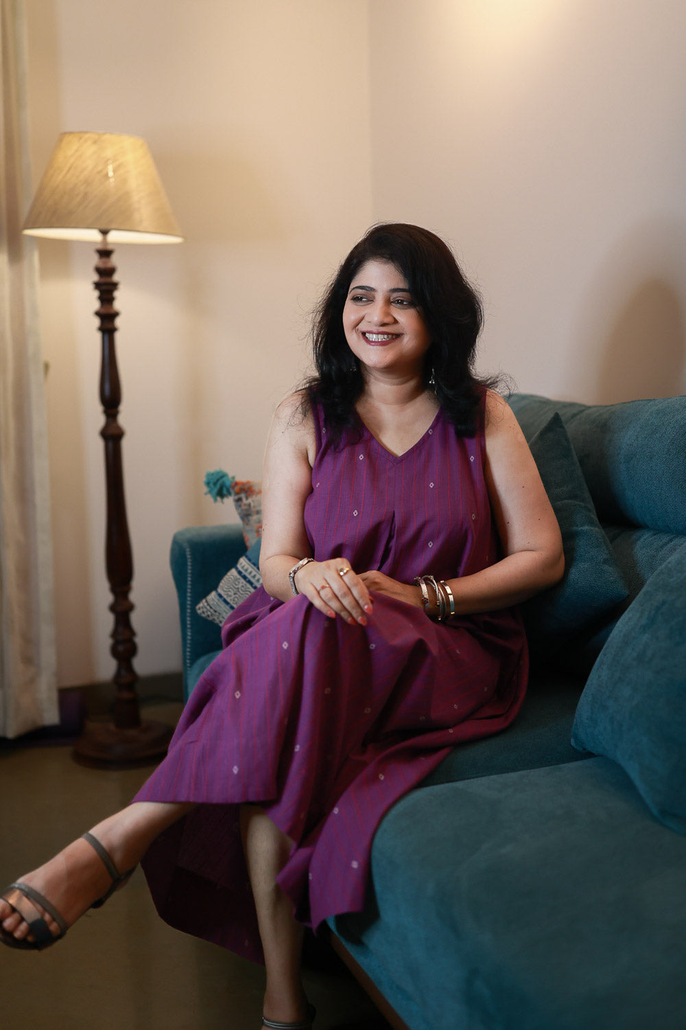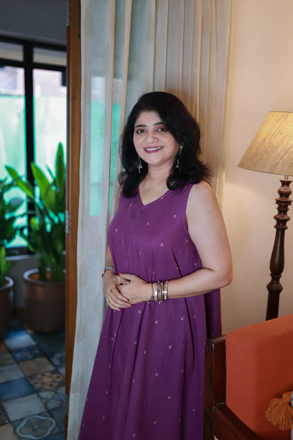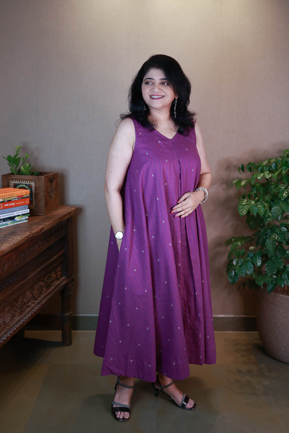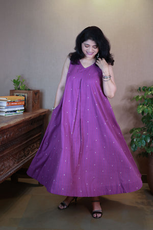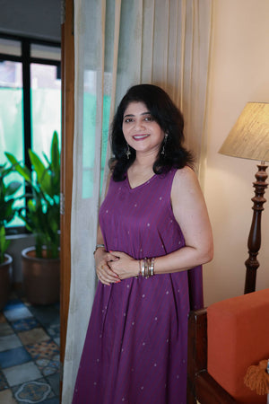 Purple pure cotton self-woven fabric sleeveless long kurta cum dress. V neck with a pleat in the front for the comfort fit. 1 side pocket. No sleeves attached,