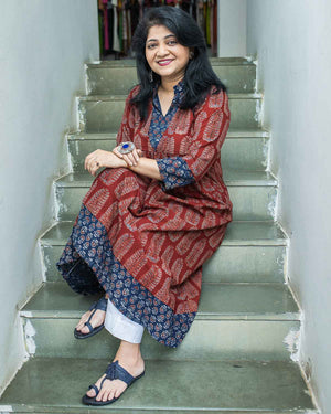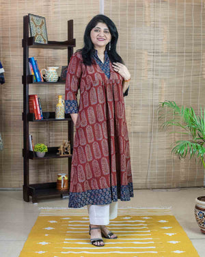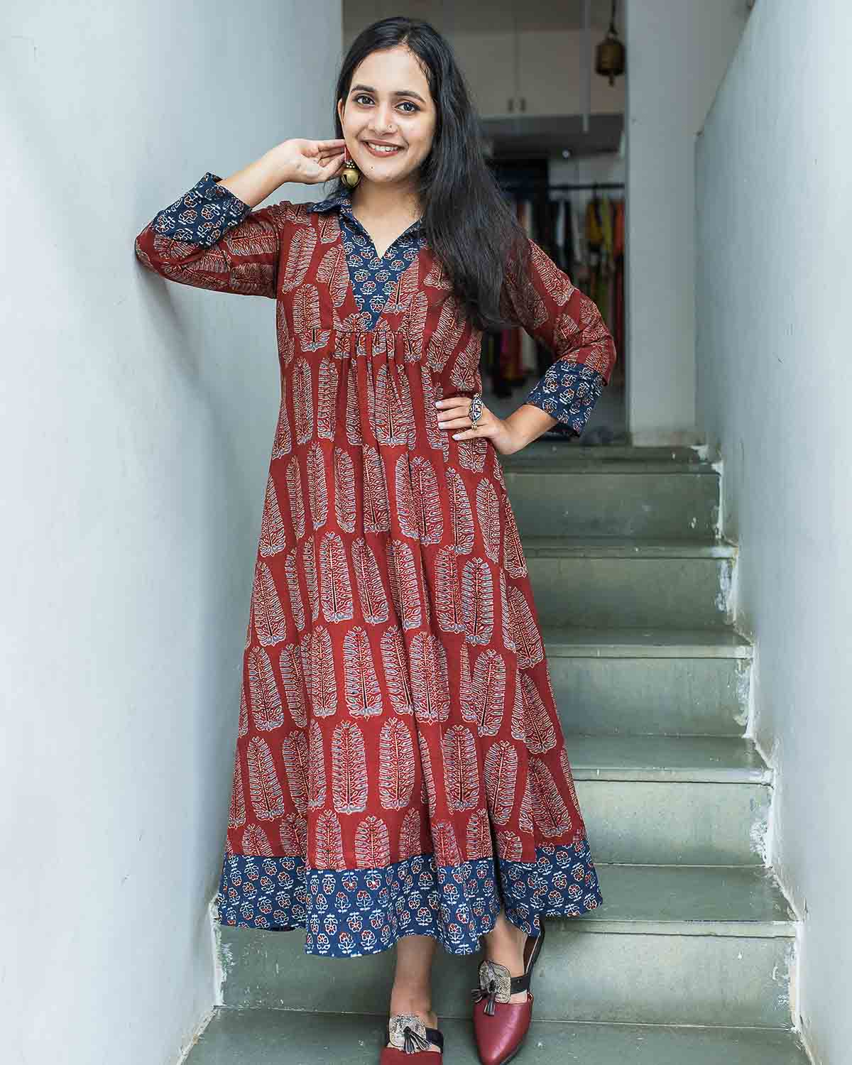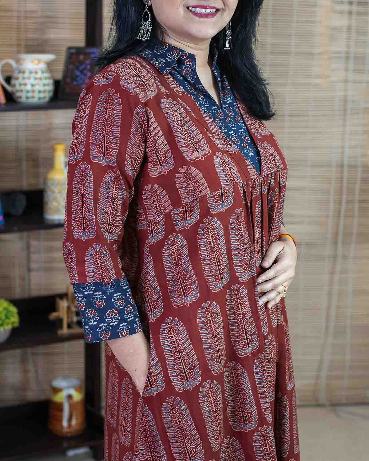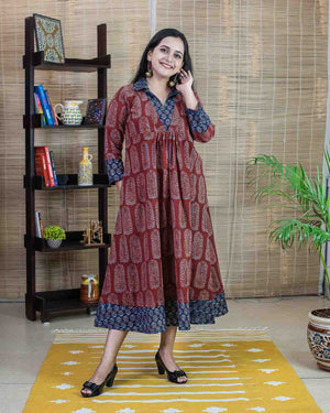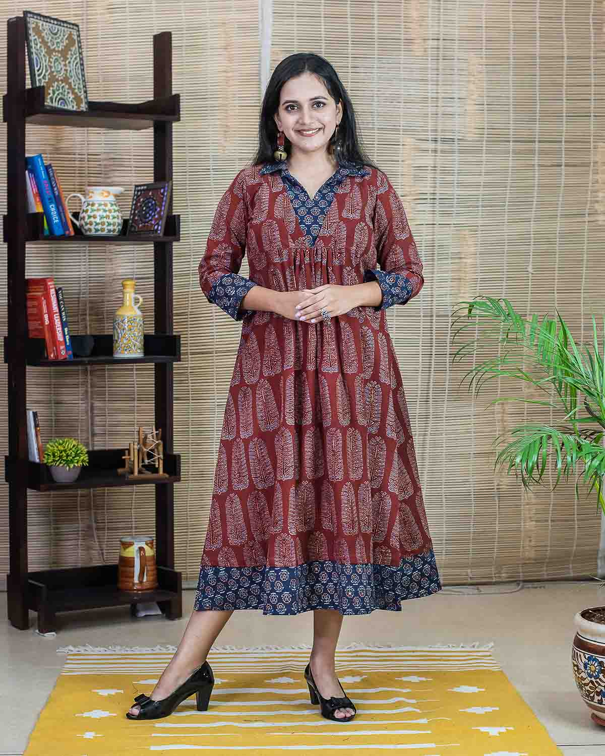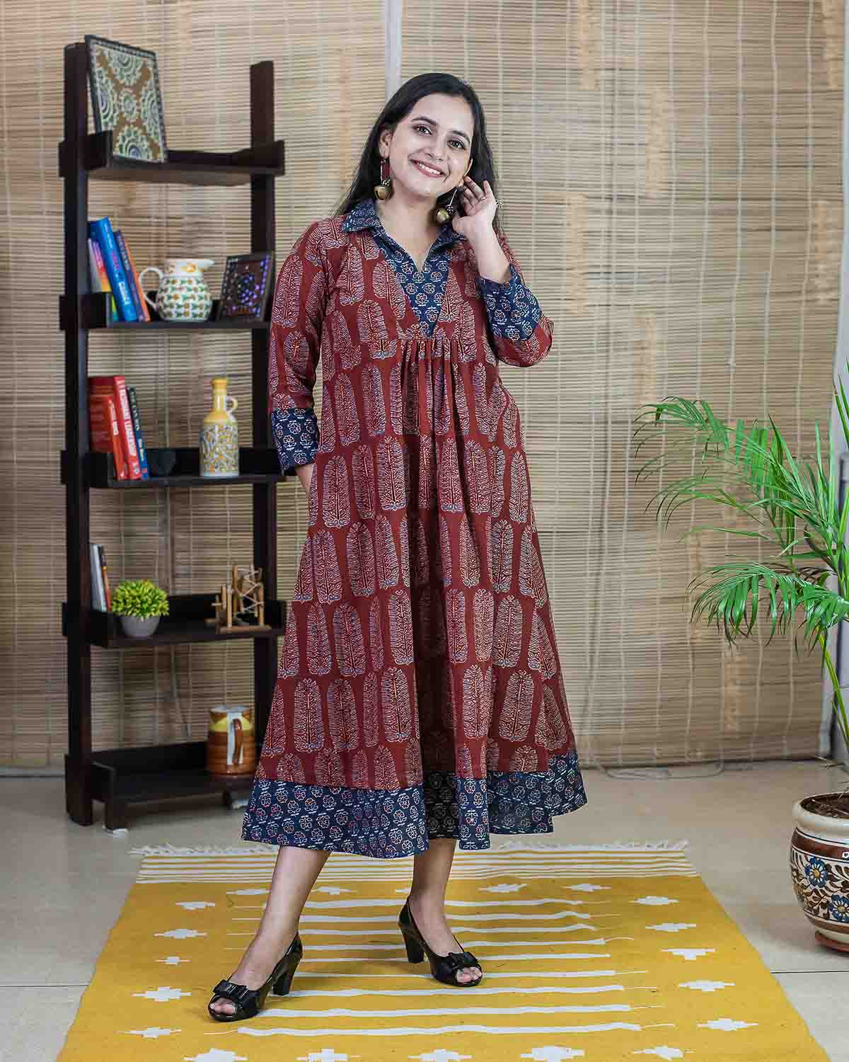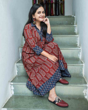 Red ajrakh hand block printed Dress cum Kurta. It has a geometric & floral special ajrakh fabric pattern in the front. Collar and pleats in the front. 1 side pocket.